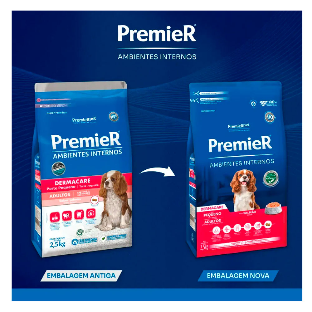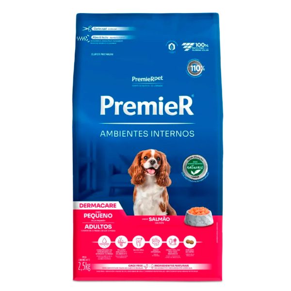 A Ração Premier Ambientes Internos Dermacare Raças Pequenas Adultos Salmão é um alimento Super Premium específico para cães com este estilo de vida.