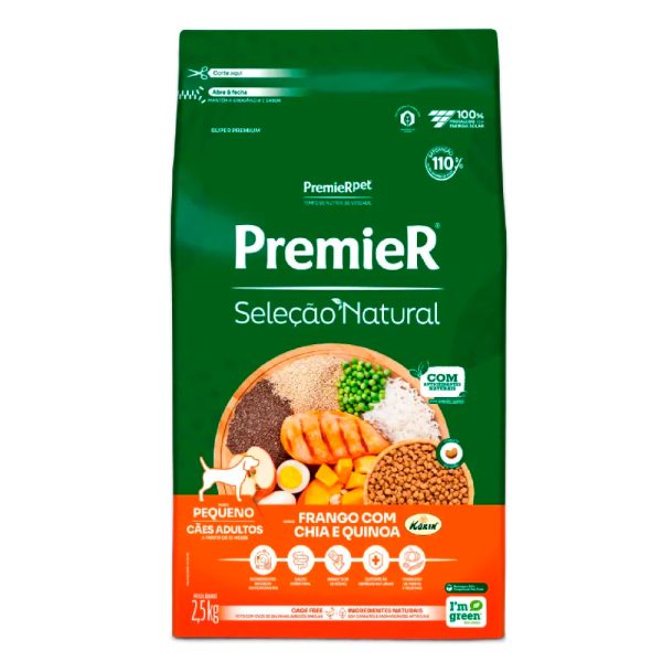 A Ração Premier Seleção Natural Cães Adultos Pequeno Porte Frango com Chia e Quinoa contém exclusiva fonte de proteína proveniente do frango Korin, possui na sua formulação chia, quinoa, extrato de marigold, abóbora e cenoura, ingredientes ricos em antioxidantes que auxiliam no combate aos radicais livres.