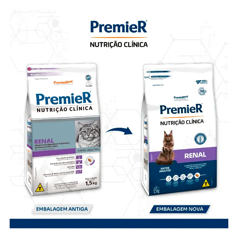 A Premier Nutrição Clínica Renal um alimento super premium para auxiliar o tratamento da doença renal crônica dos gatos. O tratamento prescrito pelo médico veterinário, algumas alterações na alimentação podem ser benéficas para pacientes com doença renal crônica.