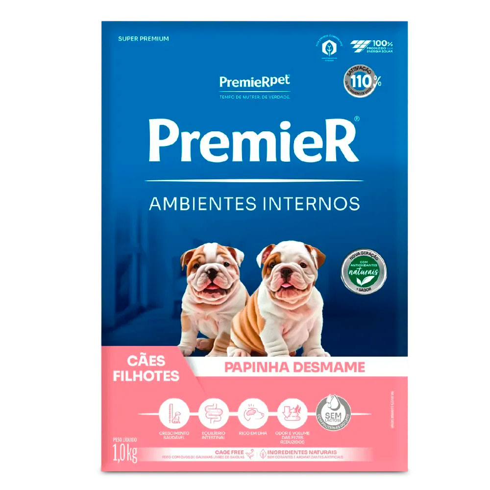 A Papinha Desmame Premier Ambientes Internos é um alimento Super Premium em pó desenvolvido especialmente para cães filhotes, ideal para a fase de transição do leite materno para a alimentação sólida.