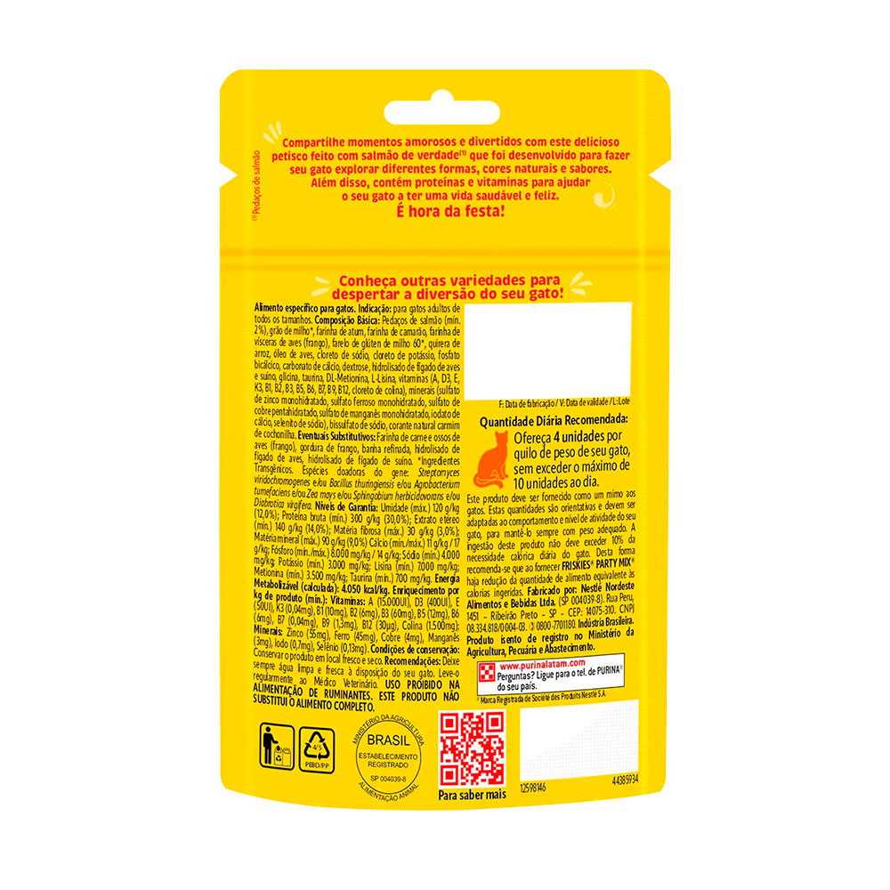 O Friskies Party é um delicioso petisco feito com salmão, desenvolvido para fazer seu gato explorar diferentes formas, cores naturais e sabores. Além disso, contém proteínas e vitaminas para ajudar o seu gato a ter uma vida saudável e feliz.