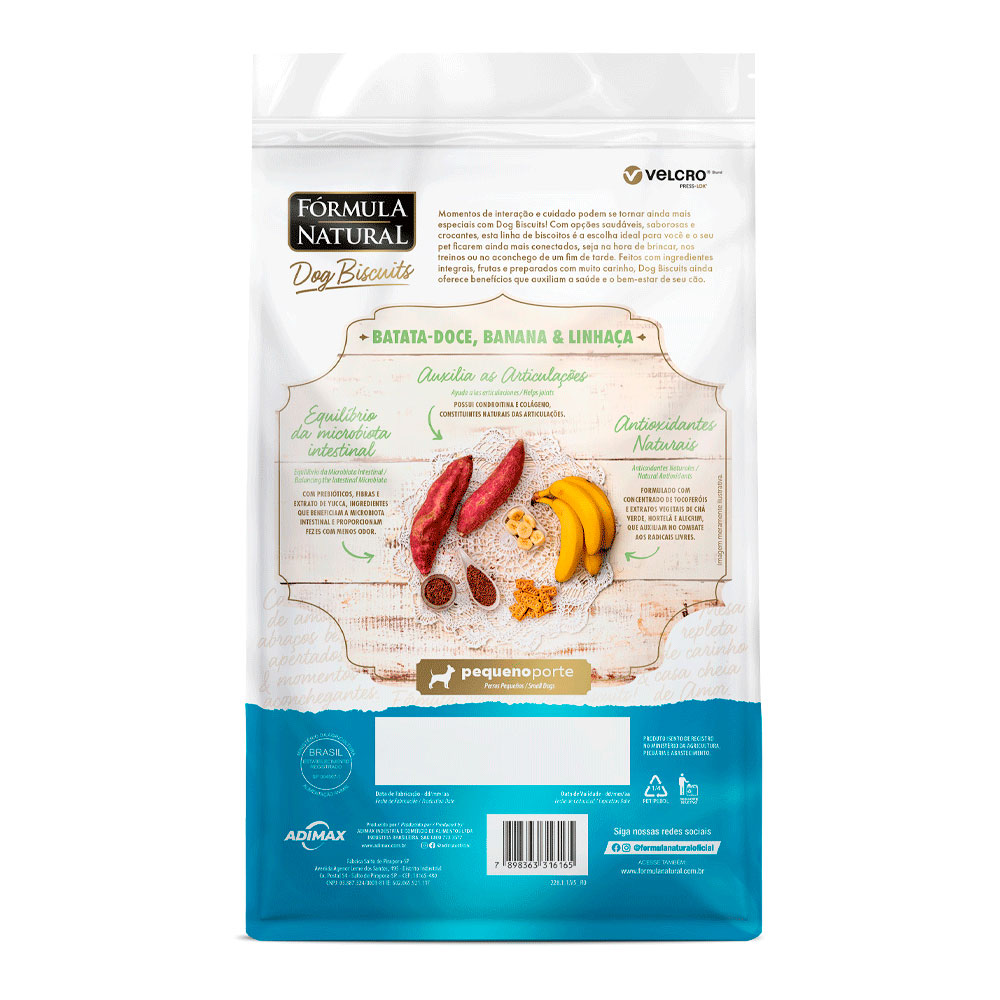 Feito com ingredientes naturais como batata doce, banana e linhaça são fontes de fibras e antioxidantes que ajudam no equilíbrio da flora intestinal e bem-estar geral. Contém com condroitina, colágeno e cúrcuma, contribui para saúde das articulações, pele e pelagem mais bonitas e saúde oral.