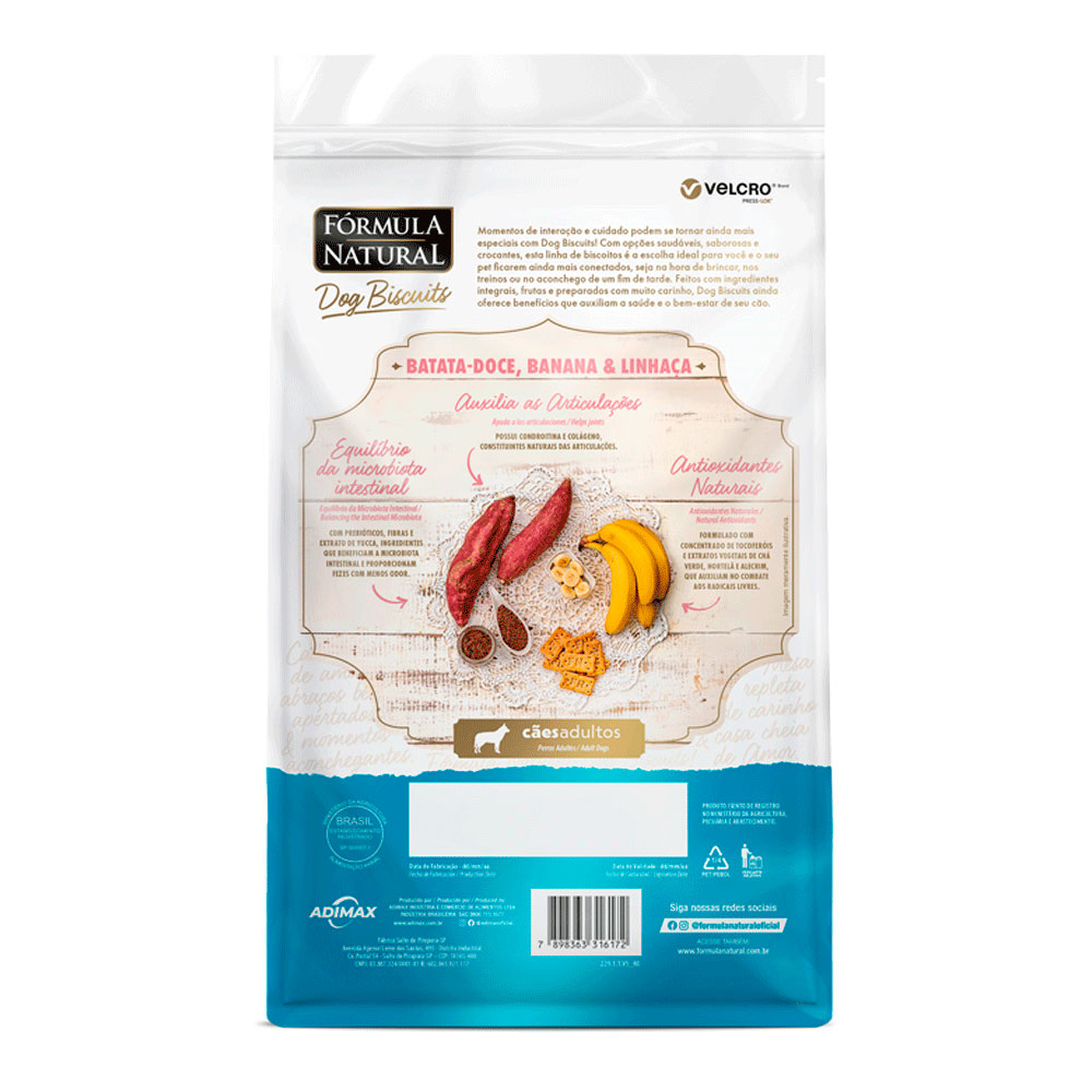Feito com batata doce, banana e linhaça, oferecendo um sabor delicioso que agrada até os paladares mais exigentes, auxilia na proteção celular e bem-estar geral. Textura crocante ajuda na limpeza mecânica dos dentes, promovendo melhor saúde bucal. Possui nutrientes importantes favorecem brilho e hidratação natural dos pelos e presença de prebióticos que colaboram com a digestão saudável.