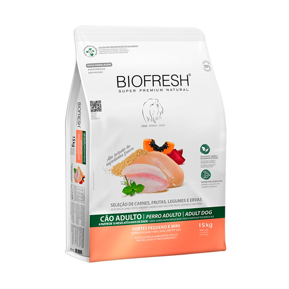 A Ração Seca Biofresh Mix de Carne, Frutas, Legumes e Ervas Frescas Cães Adultos possui inclusão de ingredientes totalmente frescos, resultando em um alimento rico em nutrientes.