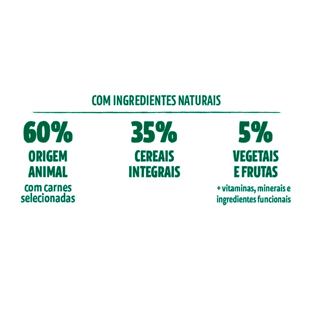 Seleção de Ingredientes de Origem Animal, mín. 65% (dos quais mín. 16% são Carnes Selecionadas: Carne Mecanicamente Separada de Frango e Fígado de Frango; Farinha de Vísceras de Aves, Farinha de Torresmo, Ovo em Pó, Óleo de Vísceras de Aves, Gordura Suína, Óleo de Peixe Refinado, Hidrolisado de Fígado Ave e Suíno). Seleção de Cereais Integrais, mín. 30% (Arroz Integral, Grão de Aveia, Cevada em Grão, Grão de Sorgo).Seleção de Vegetais, Frutas, Vitaminas, Minerais e Ingredientes Funcionais, máx. 5% (dos quais máx. 3% são Vegetais e Frutas Selecionados: Ervilha, Brócolis Desidratado, Espinafre Desidratado, Cenoura Desidratada, Mirtilo Desidratado “Blueberry”, Amora Desidratada, Maçã Desidratada, Manga Desidratada, Polpa de Beterraba, Farinha da Alga Schizochytrium sp., Semente de Psyllium, Levedura Seca de Cervejaria, Óleo de Linhaça; Cloreto de Potássio, Carbonato de Cálcio, Sulfato de Condroitina, Sulfato de Glicosamina, Parede Celular de Levedura Fonte de Beta-Glucanos, Extrato de Yucca mín. 0,05%, L-Lisina, DL-Metionina, Propionato de Cálcio, Sorbato de Potássio, Aditivos Prebióticos: Inulina e Parede Celular de Levedura Fonte de Mananoligossacarídeos; Antioxidantes Naturais: Extrato de Alecrim e Concentrado de Tocoferóis; Aditivo Adsorvente: Parede Celular de Levedura e Bentonita; Vitaminas: A, D3, E, K3, C, B1, B2, B6, B12, Pantotenato de Cálcio, Ácido Fólico, Ácido Nicotínico, Biotina, Cloreto de Colina; Minerais: Sulfato de Zinco, Sulfato de Ferro, Sulfato de Manganês, Iodato de Cálcio; Minerais Quelatados: Proteinato de Manganês, Levedura Enriquecida com Selênio, Proteinato de Zinco, Proteinato de Cobre).