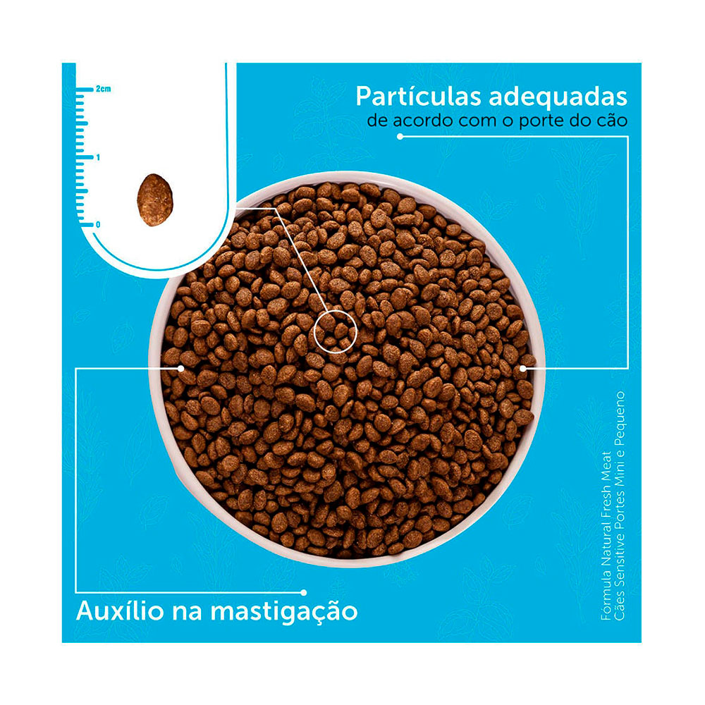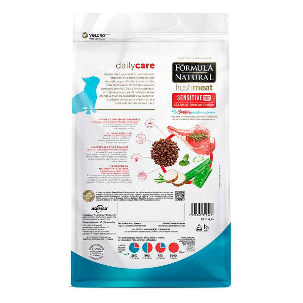 Além disso, sua receita fornece nutrientes que atendem as necessidades de forma equilibrada, dos cães adultos de porte mini e pequeno. A embalagem I’m Green, foi desenvolvida em polietileno verde, com o sistema VELCRO®. O sistema de fechamento PRESS-LOK facilita o abrir e fechar do manuseio diário. A linha Fórmula Natural Fresh Meat foi desenvolvida por médicos veterinários utilizando os conceitos mais avançados de nutrição para sua elaboração.