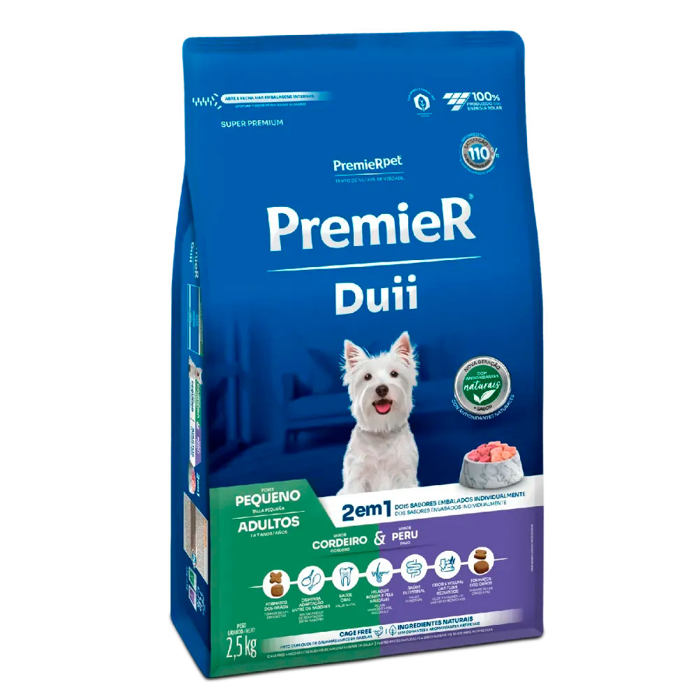 A Ração Premier Duii Porte Pequeno Cordeiro e Peru é um alimento Super Premium que proporciona uma experiência exclusiva: dois sabores embalados individualmente que podem ser alternados sem a necessidade de adaptação, unindo ingredientes de alta qualidade, tecnologia e excelente sabor.