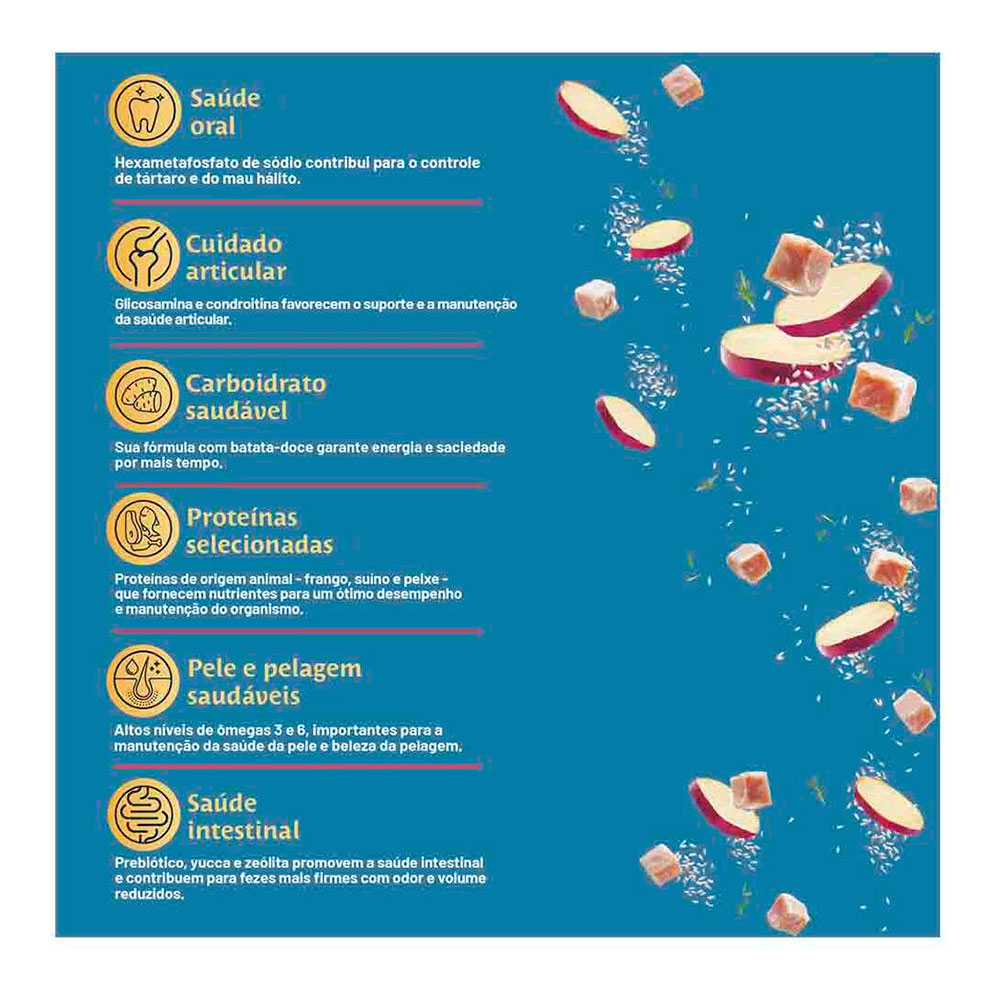 Sua fórmula com batata doce garante energia e saciedade por mais tempo. Proteínas de origem animal – salmão, frango e suíno – que fornecem nutrientes para um ótimo desempenho e manutenção do organismo.