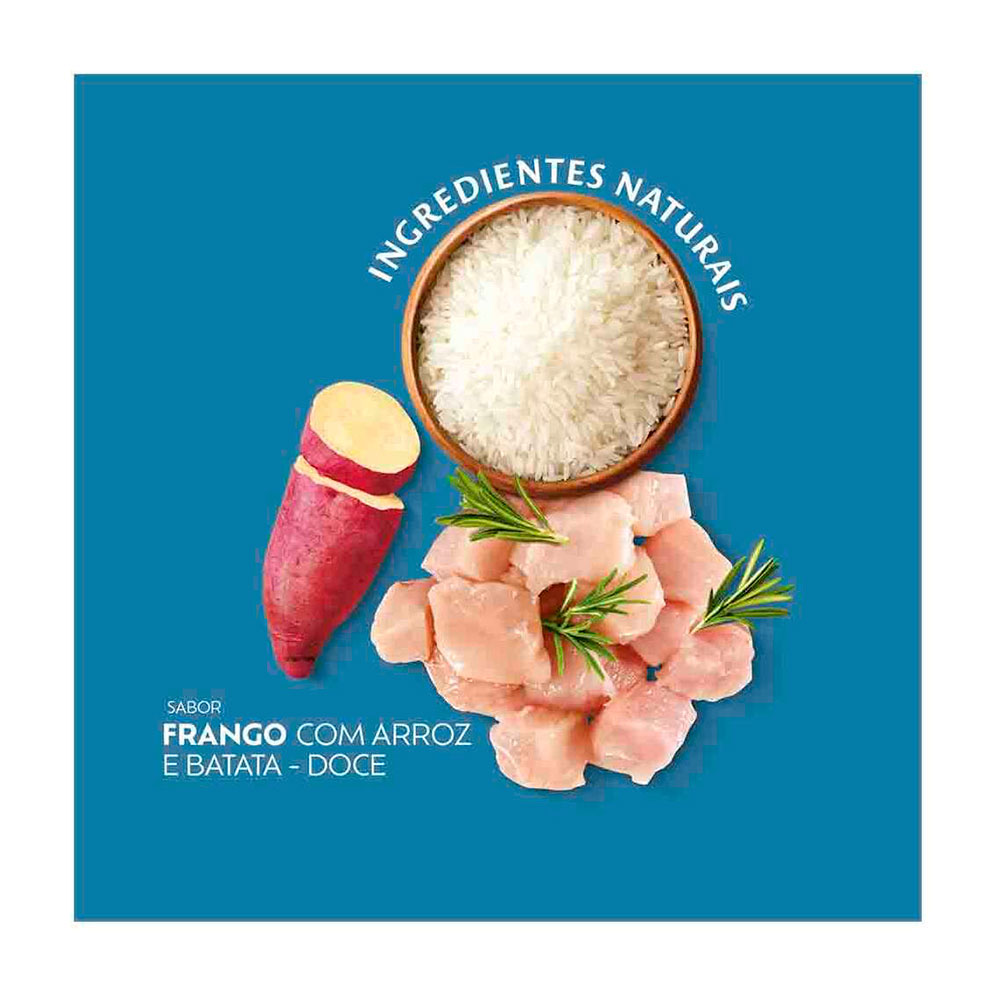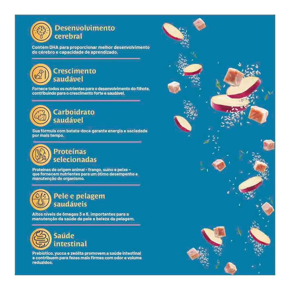 Fórmula com batata doce garante energia e saciedade por mais tempo. Altos níveis de ômegas 3 e 6, importantes para a manutenção da saúde da pele e beleza da pelagem. Fornece todos os nutrientes para o desenvolvimento do filhote, contribuindo para o crescimento forte e saudável.