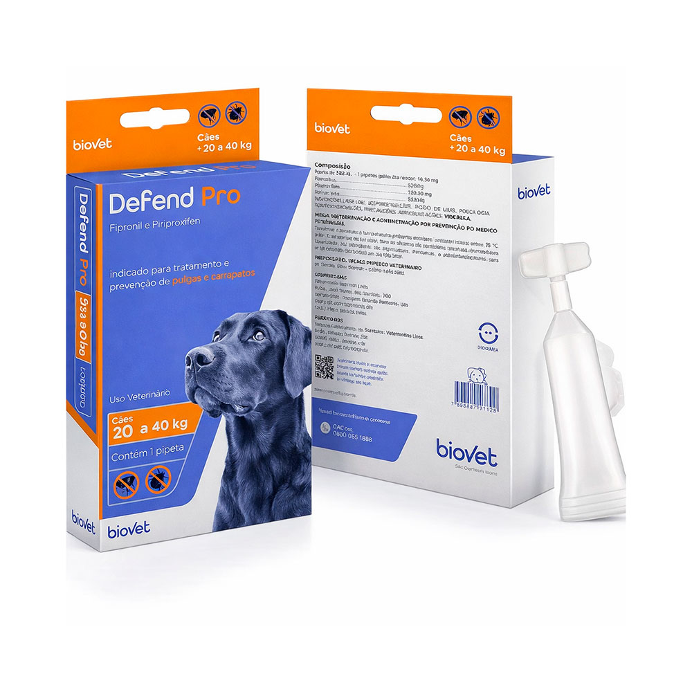 O Defend Pro Biovet para Cães 20kg a 40kg é um antipulgas e carrapaticida de uso tópico, desenvolvido para o tratamento e prevenção de infestações por pulgas e carrapatos em cães de pequeno porte.
