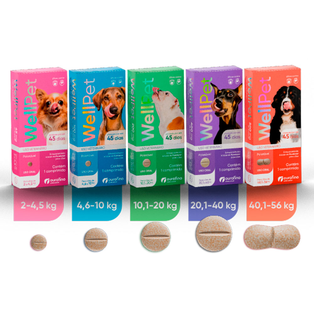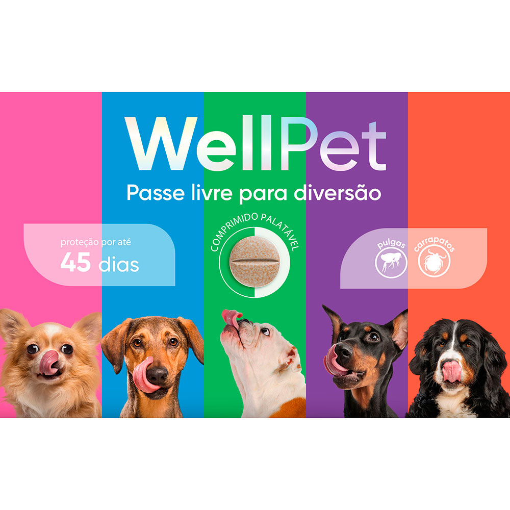 Antipulgas e Carrapatos Wellpet indicado para prevenir e combater infestações causadas por pulgas (Ctenocephalides felis felis) e carrapatos (Rhipicephalus sanguineus) em cães, garantindo proteção por até 45 dias. Comprimidos palatável com o princípio ativo Fluralaner.