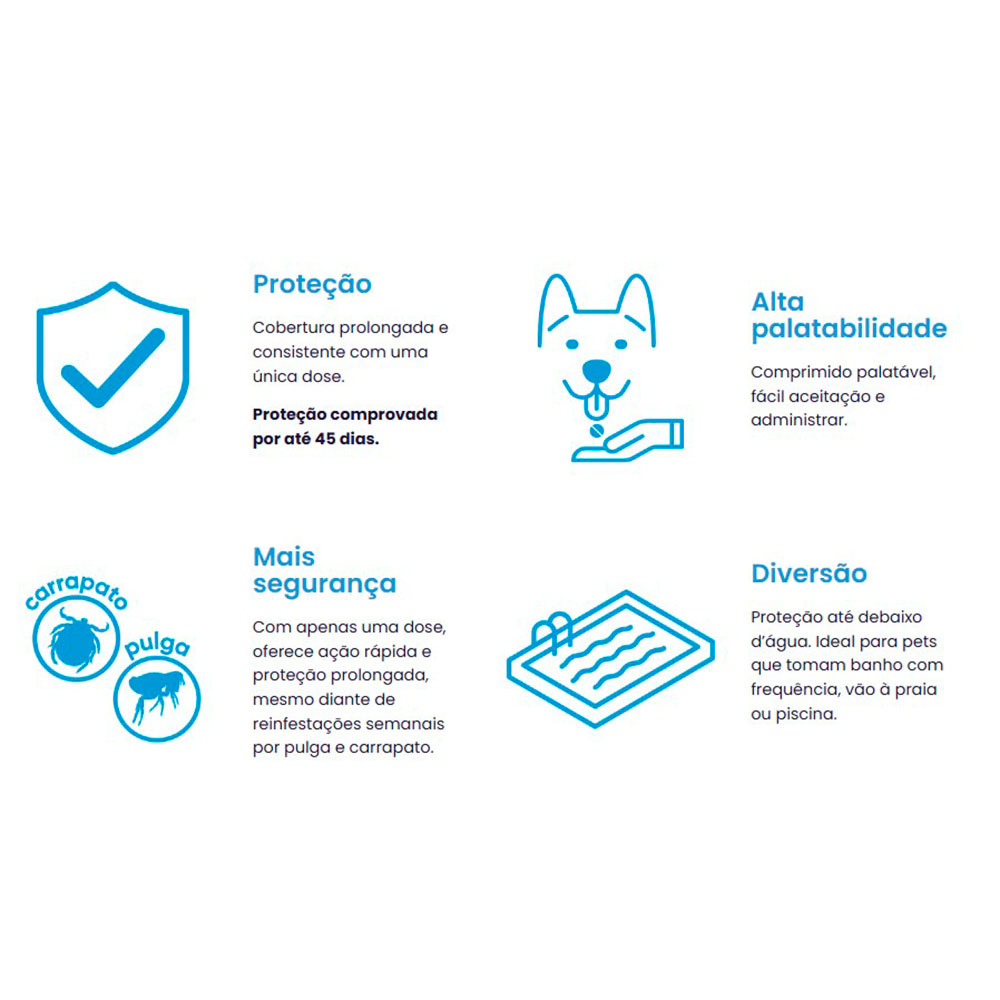 • Protege o animal por até 45 dias contra pulgas e carrapatos. Sabor agradável de carne.