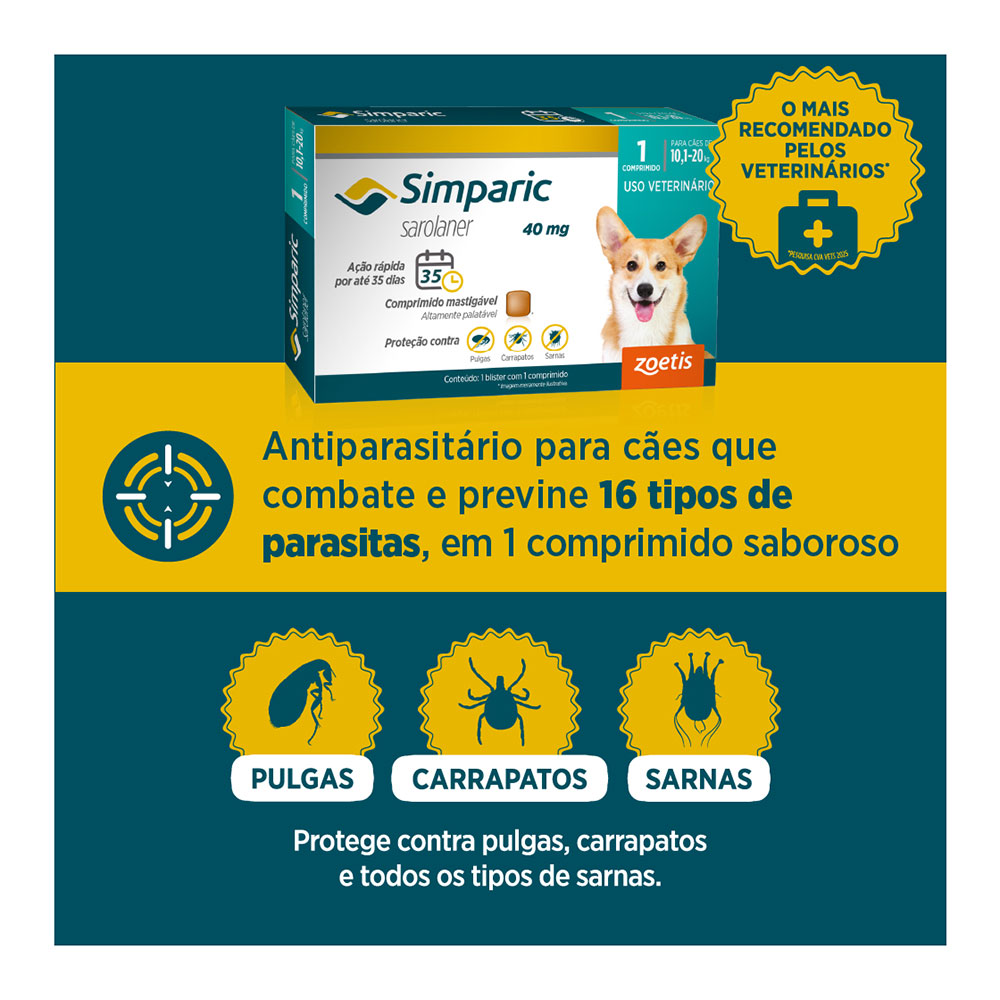 O simparic ajuda também a combater até três tipos de sarna a Sarcópticas, Demodécica e Otodécica, tem fácil aceitação pelos cachorros pois os comprimidos são palatáveis e saborosos.