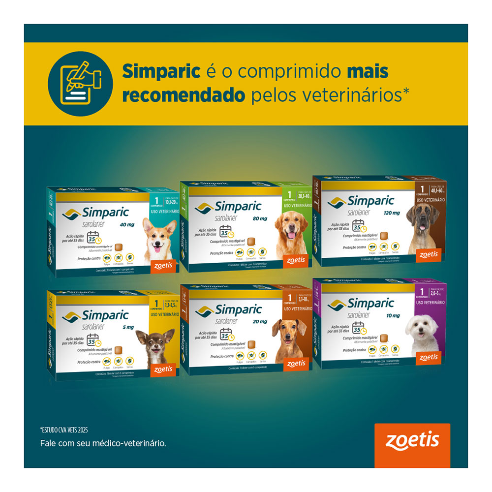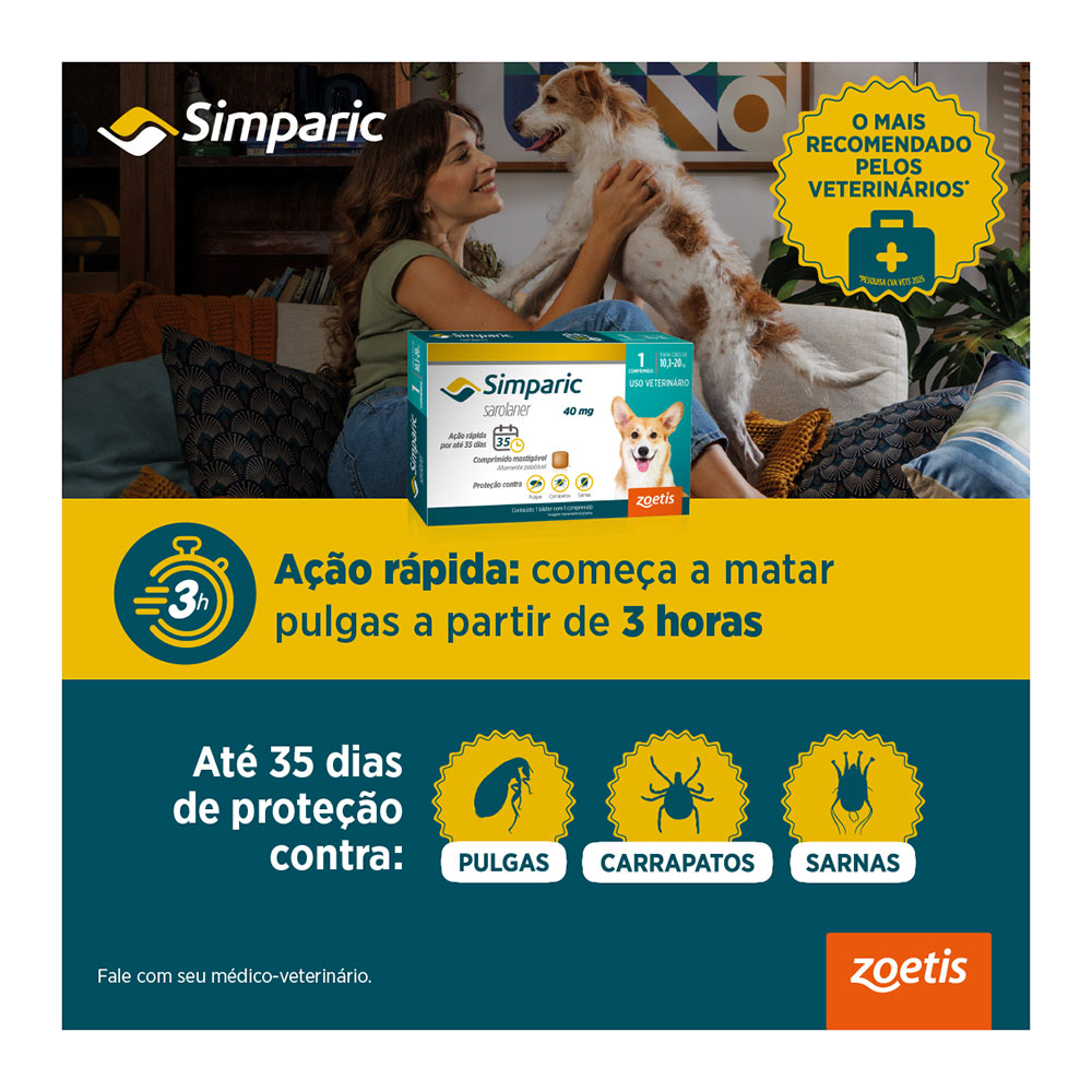 O Antipulgas e carrapatos Simparic 120mg foi desenvolvido para combater as indesejadas pulgas e carrapatos, mantendo sua eficácia por até 35 dias.
