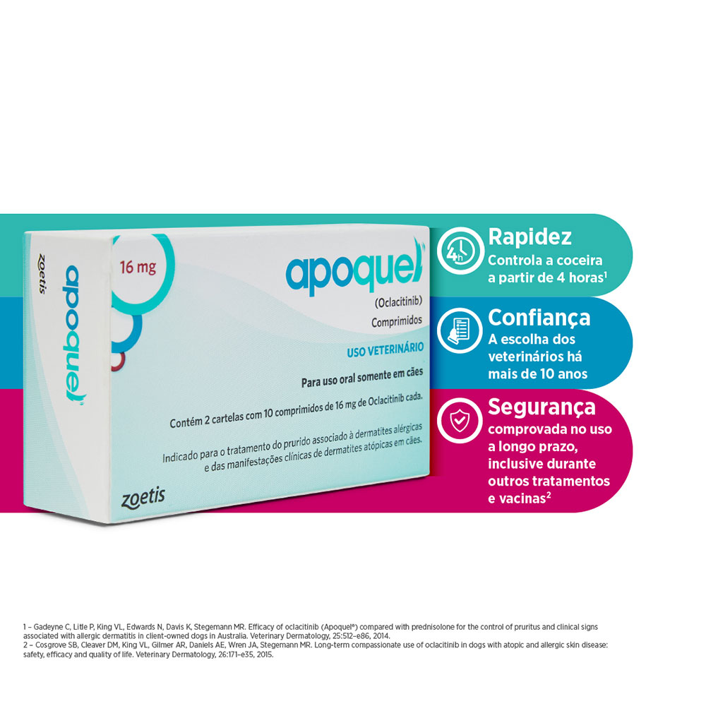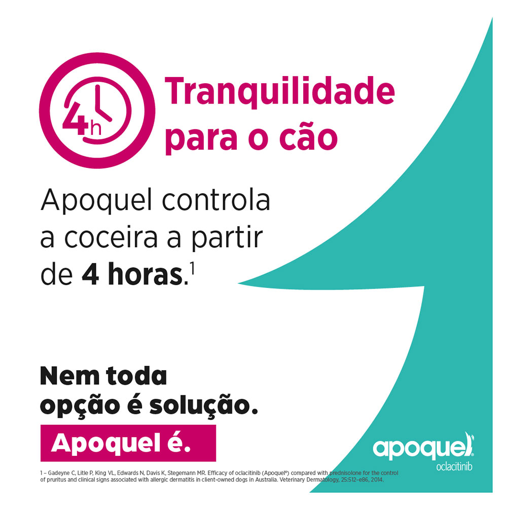 Apoquel contém Oclacitinib, que age bloqueando as substâncias do corpo responsáveis pela coceira e inflamação em cães com dermatites alérgicas, incluindo a dermatite atópica. Por agir diretamente nessas fontes, Apoquel proporciona alívio rápido, a partir de 4 horas após a administração.