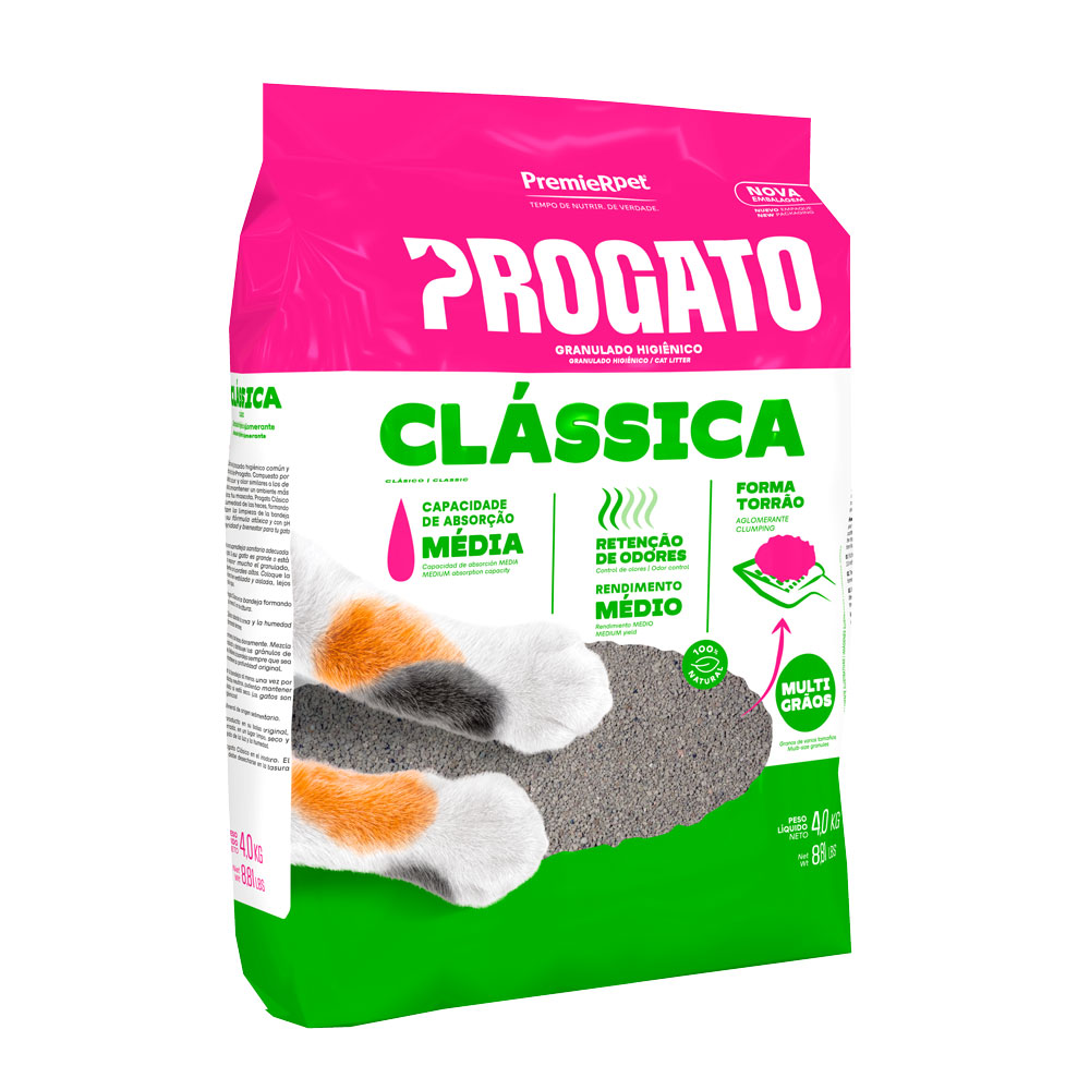 Progato Clássica é ideal para a higiene do seu felino, composta por grãos pequenos e médios – multigrãos, garantindo maior conforto ao gato, já que remete à textura e coloração encontrada na natureza.