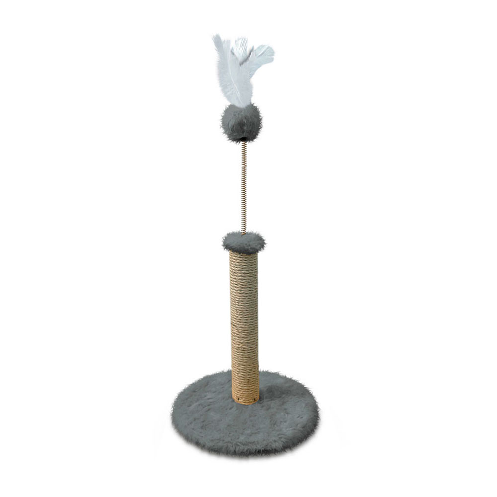 O arranhador contém uma bolinha com penas, presa a um elástico, é um atrativo irresistível para o gato, incentivando brincadeiras e estimulando o instinto de caça.