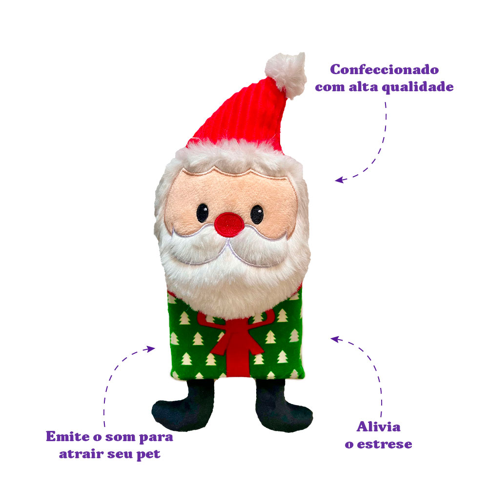 Com design de Papai Noel em traje característico, em pelúcia macia. Um mordedor embutido que estimula o ato de mastigar com segurança, perfeito para brincadeiras seguras e mordidas leves, estimula a interação, ajuda a reduzir o estresse e mantém seu pet entretido com muito conforto e fofura.