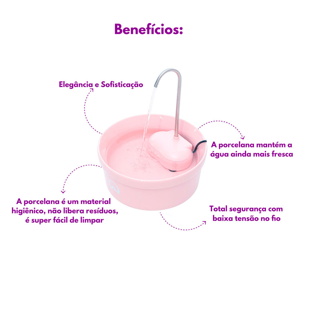 Oferece água corrente constantemente, o que incentiva cães e gatos a beberem mais, essencial para a prevenção de problemas urinários e renais. A porcelana conserva a água fresca por mais tempo, perfeita para dias quentes, o acabamento em porcelana facilita a higienização, tornando a rotina de limpeza mais prática.