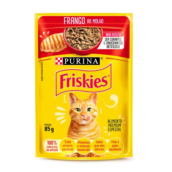 O Ração Úmida Friskies Gatos Adultos Frango ao Molho um alimento completo e saboroso que os gatos adoram. Com pedaços suculentos de frango e um delicioso molho, sem a adição de corantes e conservantes artificiais.