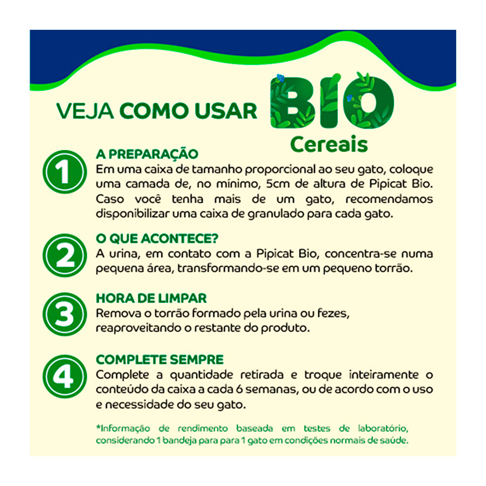 – Em uma caixa de tamanho proporcional ao seu gato, coloque uma camada de, no mínimo, 5 cm de altura de Pipicat Bio Cereais. Caso você tenha mais de um gato, recomendamos disponibilizar uma caixa de granulado para cada gato.