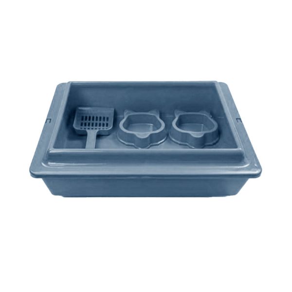 Possui pazinha para recolher os dejetos e auxiliar na limpeza e colocação da areia, além disso tem um comedouro e um bebedouro com tamanho ideal e quantidade na dose certa para o seu felino.