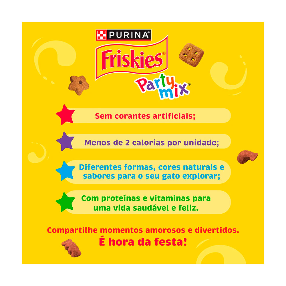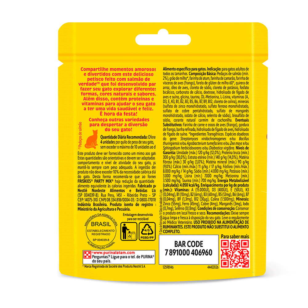 O Friskies Party é um delicioso petisco feito com salmão, desenvolvido para fazer seu gato explorar diferentes formas, cores naturais e sabores. Além disso, contém proteínas e vitaminas para ajudar o seu gato a ter uma vida saudável e feliz.