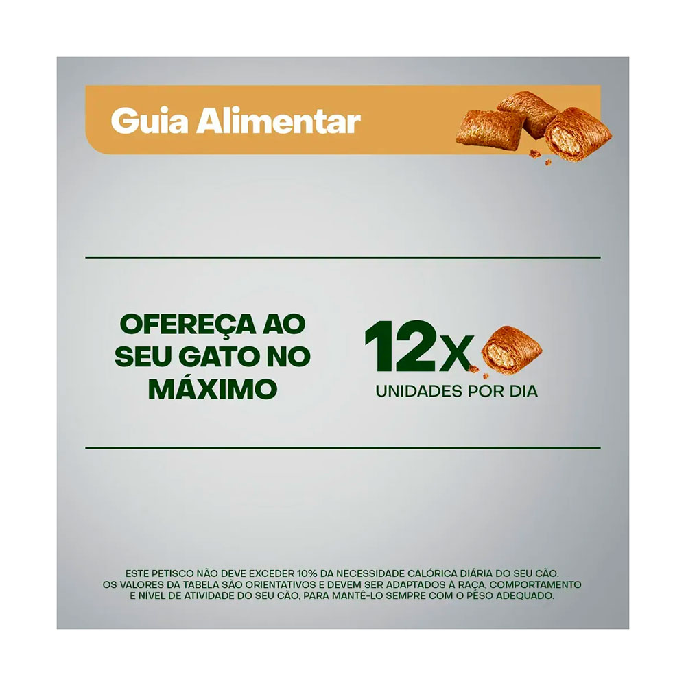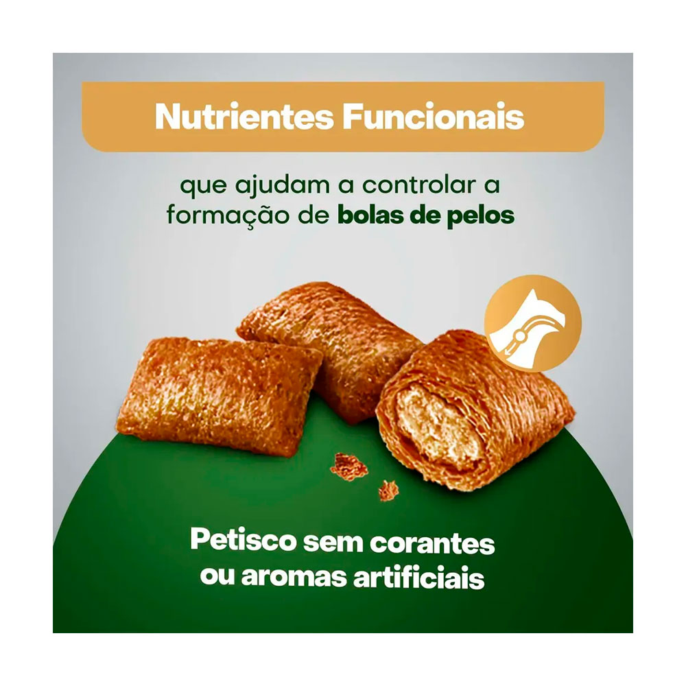 Um snack funcional especialmente desenvolvido para gatos adultos, com sabor atrativo de carne e linhaça e formulação enriquecida com ingredientes que auxiliam o trato digestivo e o controle de bolas de pelo.
