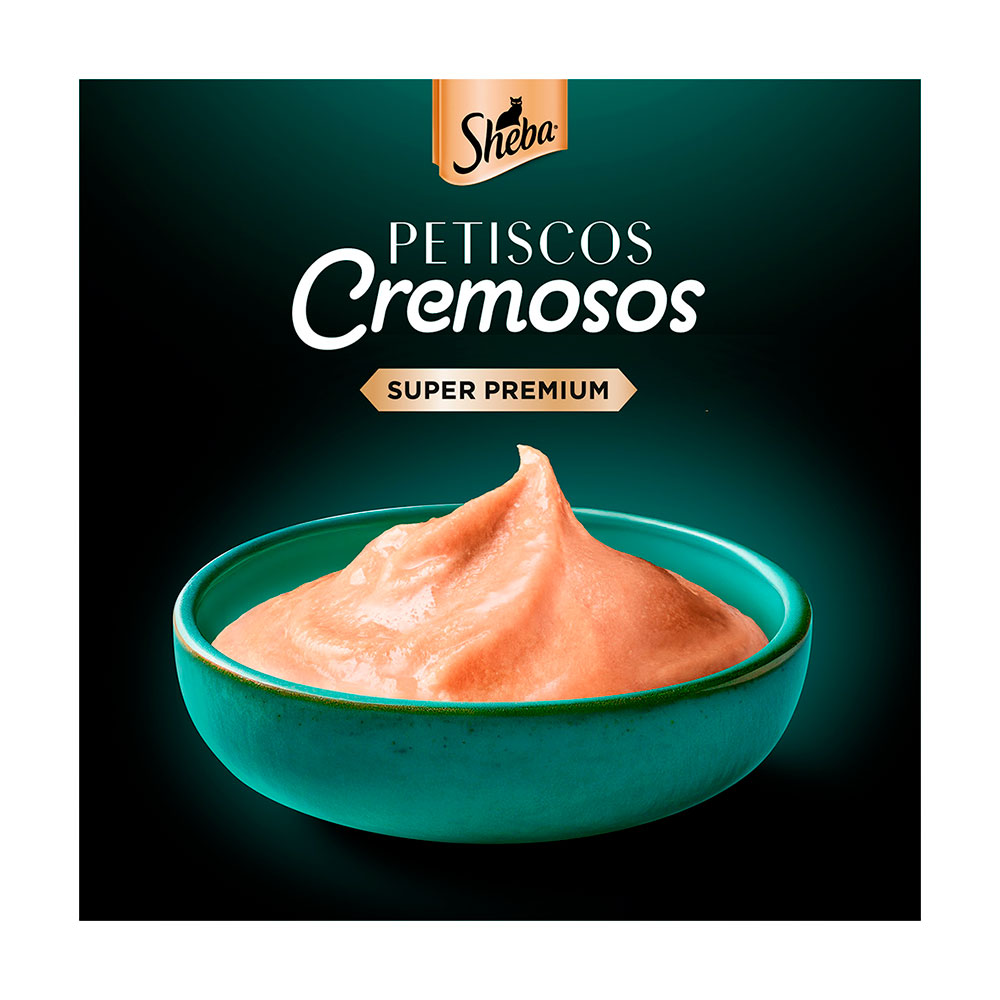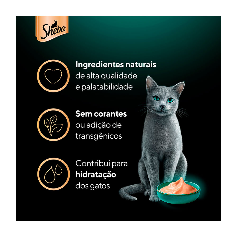 Sheba Cremoso é um purê feito com ingredientes naturais, possui baixa caloria e ajuda a manter o trato urinário dos gatos saudável devido ao alto teor de umidade.