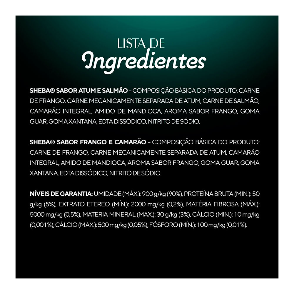 Sheba Sabor Atum e Salmão: Carne de Frango, Carne Mecanicamente Separada de Atum, Carne de Salmão, Camarão Integral, Amido de Mandioca, Aroma Sabor Frango, Goma Guar, Goma Xantana, Edta Dissódico, Nitrito de Sódio.