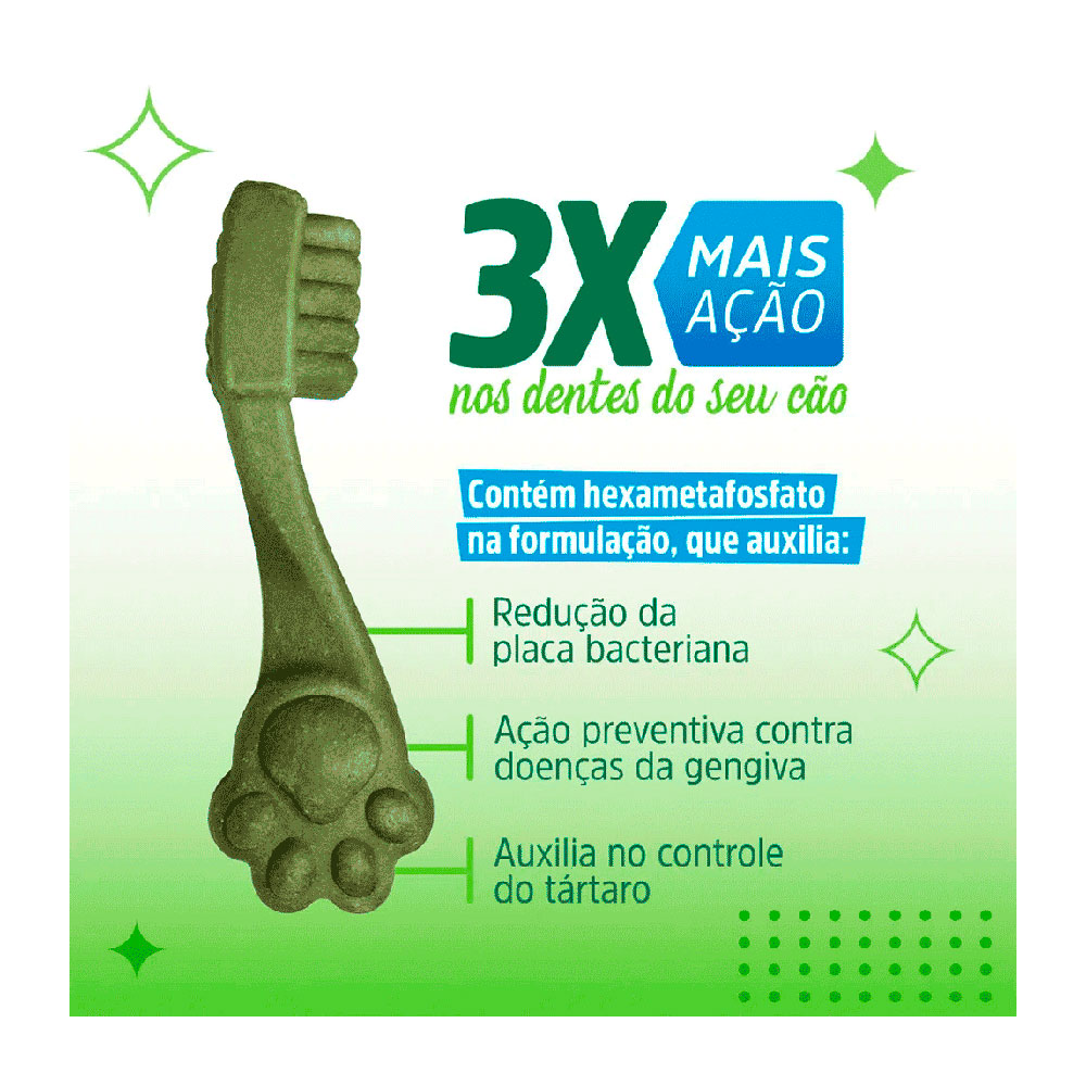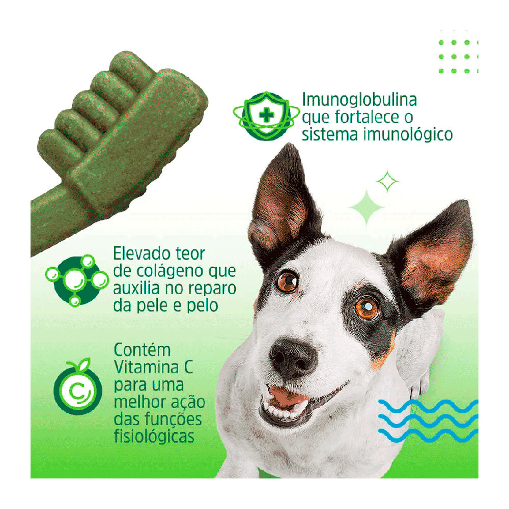 Auxilia na redução da placa bacteriana, ajuda no controle do tártaro. Com ação preventiva contra doenças da gengiva e elevado teor de colágeno.