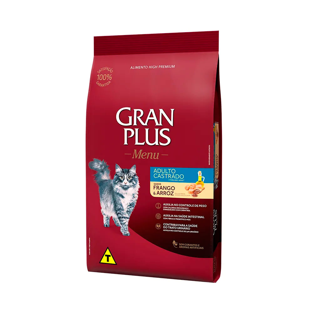 A Ração GranPlus Menu Gatos Adultos Castrados Frango e Arroz um alimento com ingredientes nobres e funcionais, que proporciona uma experiência irresistível para seu gato pois não contém corantes e aromatizantes artificiais.
