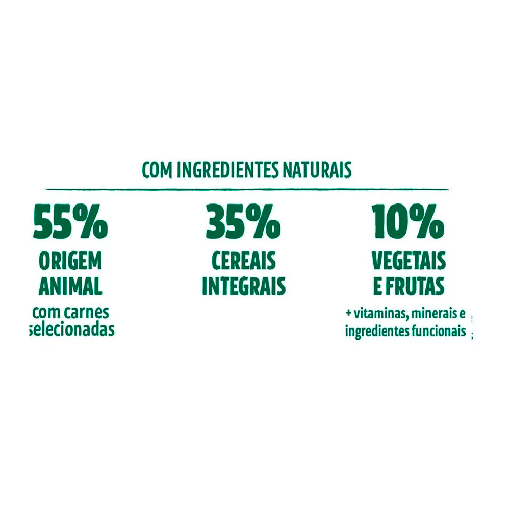 Seleção de Ingredientes de Origem Animal, mín. 55% (dos quais mín. 16% são Carnes Selecionadas: Carne Mecanicamente Separada de Frango e Fígado de Frango; Farinha Mista de Peru e Frango, Farinha de Vísceras de Aves, Farinha de Torresmo, Ovo em Pó, Óleo de Vísceras de Aves, Gordura Suína, Óleo de Peixe Refinado, Hidrolisado de Fígado Ave e Suíno). Seleção de Cereais Integrais, mín. 35% (Arroz Integral, Grão de Aveia, Cevada em Grão, Grão de Sorgo). Seleção de Vegetais, Frutas, Vitaminas, Minerais e Ingredientes Funcionais, máx. 10% (dos quais máx. 8% são Vegetais e Frutas Selecionados: Ervilha, Brócolis Desidratado, Espinafre Desidratado, Cenoura Desidratada, Mirtilo Desidratado “Blueberry”, Amora Desidratada, Maçã Desidratada, Manga Desidratada, Polpa de Beterraba, Farinha da Alga Schizochytrium sp., Semente de Psyllium, Casca de Aveia Moída, Casca de Ervilha Moída, Levedura Seca de Cervejaria, Óleo de Linhaça; Cloreto de Potássio, Carbonato de Cálcio, Sulfato de Condroitina, Sulfato de Glicosamina, Parede Celular de Levedura Fonte de Beta-Glucanos, Hexametafosfato de Sódio, Extrato de Yucca, L-Lisina, Taurina, DL- Metionina, L-Carnitina, Propionato de Cálcio, Sorbato de Potássio, Aditivos Prebióticos: Inulina e Parede Celular de Levedura Fonte de Mananoligossacarídeos; Antioxidantes Naturais: Extrato de Alecrim e Concentrado de Tocoferóis; Aditivo Adsorvente: Parede Celular de Levedura e Bentonita; Vitaminas: A, D3, E, K3, C, B1, B2, B6, B12, Pantotenato de Cálcio, Ácido Fólico, Ácido Nicotínico, Biotina, Cloreto de Colina; Minerais: Sulfato de Zinco, Sulfato de Ferro, Sulfato de Manganês, Iodato de Cálcio; Minerais Quelatados: Proteinato de Manganês, Levedura Enriquecida com Selênio, Proteinato de Zinco, Proteinato de Cobre).