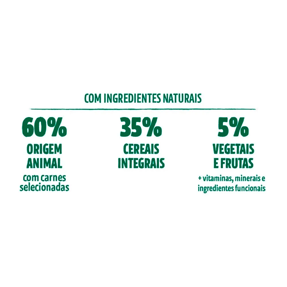 Seleção de Ingredientes de Origem Animal, mín. 65% (dos quais mín. 16% são Carnes Selecionadas: Carne Mecanicamente Separada de Frango e Fígado de Frango; Farinha de Vísceras de Aves, Farinha de Torresmo, Ovo em Pó, Óleo de Vísceras de Aves, Gordura Suína, Óleo de Peixe Refinado, Hidrolisado de Fígado Ave e Suíno). Seleção de Cereais Integrais, mín. 30% (Arroz Integral, Grão de Aveia, Cevada em Grão, Grão de Sorgo).Seleção de Vegetais, Frutas, Vitaminas, Minerais e Ingredientes Funcionais, máx. 5% (dos quais máx. 3% são Vegetais e Frutas Selecionados: Ervilha, Brócolis Desidratado, Espinafre Desidratado, Cenoura Desidratada, Mirtilo Desidratado “Blueberry”, Amora Desidratada, Maçã Desidratada, Manga Desidratada, Polpa de Beterraba, Farinha da Alga Schizochytrium sp., Semente de Psyllium, Levedura Seca de Cervejaria, Óleo de Linhaça; Cloreto de Potássio, Carbonato de Cálcio, Hexametafosfato de Sódio, Extrato de Yucca mín. 0,05%, L-Lisina, DL-Metionina, Propionato de Cálcio, Sorbato de Potássio, Aditivos Prebióticos: Inulina e Parede Celular de Levedura Fonte de Mananoligossacarídeos; Antioxidantes Naturais: Extrato de Alecrim e Concentrado de Tocoferóis; Aditivo Adsorvente: Parede Celular de Levedura e Bentonita; Vitaminas: A, D3, E, K3, C, B1, B2, B6, B12, Pantotenato de Cálcio, Ácido Fólico, Ácido Nicotínico, Biotina, Cloreto de Colina; Minerais: Sulfato de Zinco, Sulfato de Ferro, Sulfato de Manganês, Iodato de Cálcio; Minerais Quelatados: Proteinato de Manganês, Levedura Enriquecida com Selênio, Proteinato de Zinco, Proteinato de Cobre).