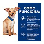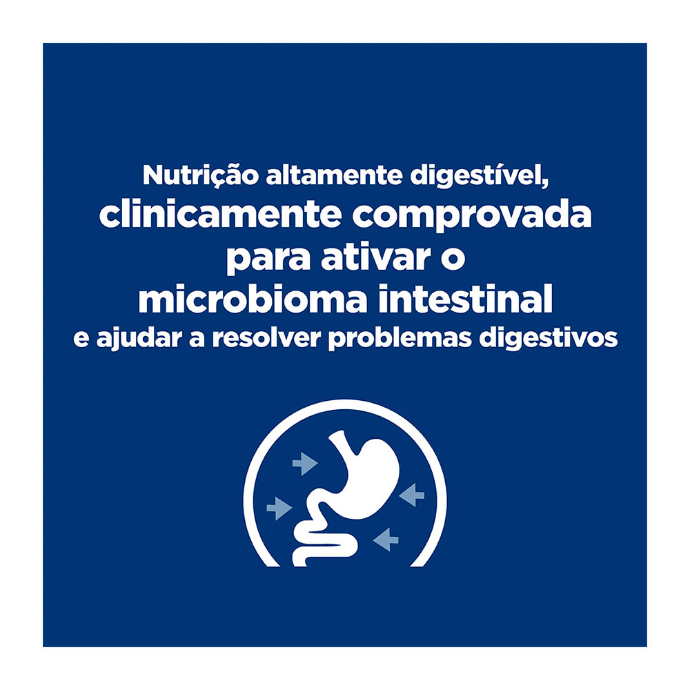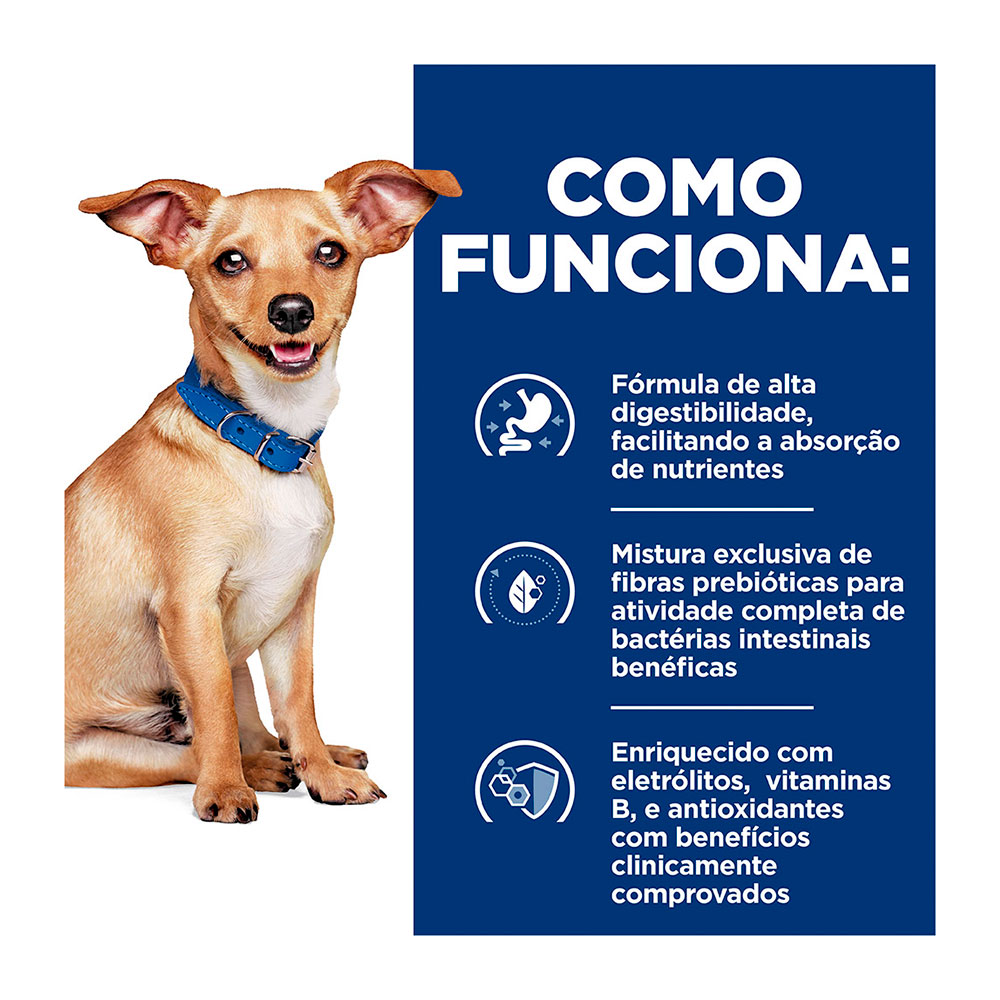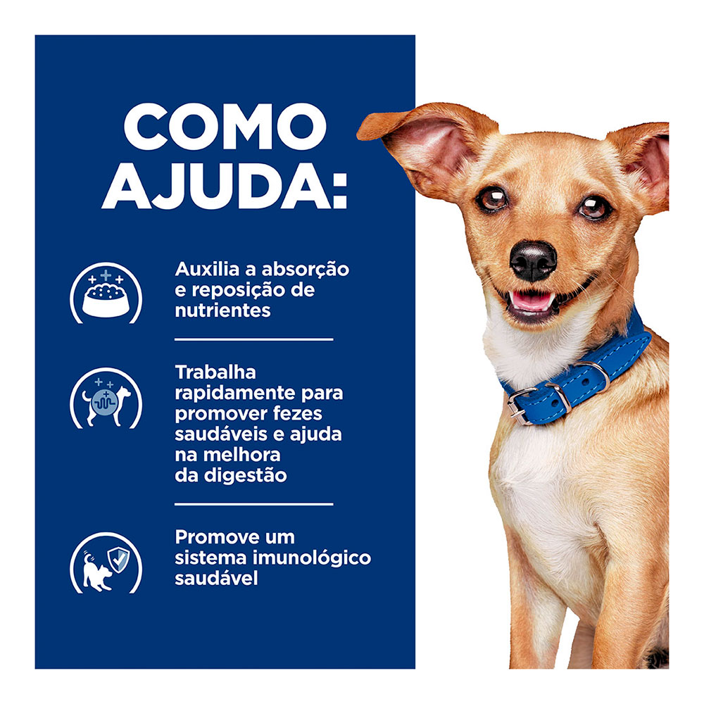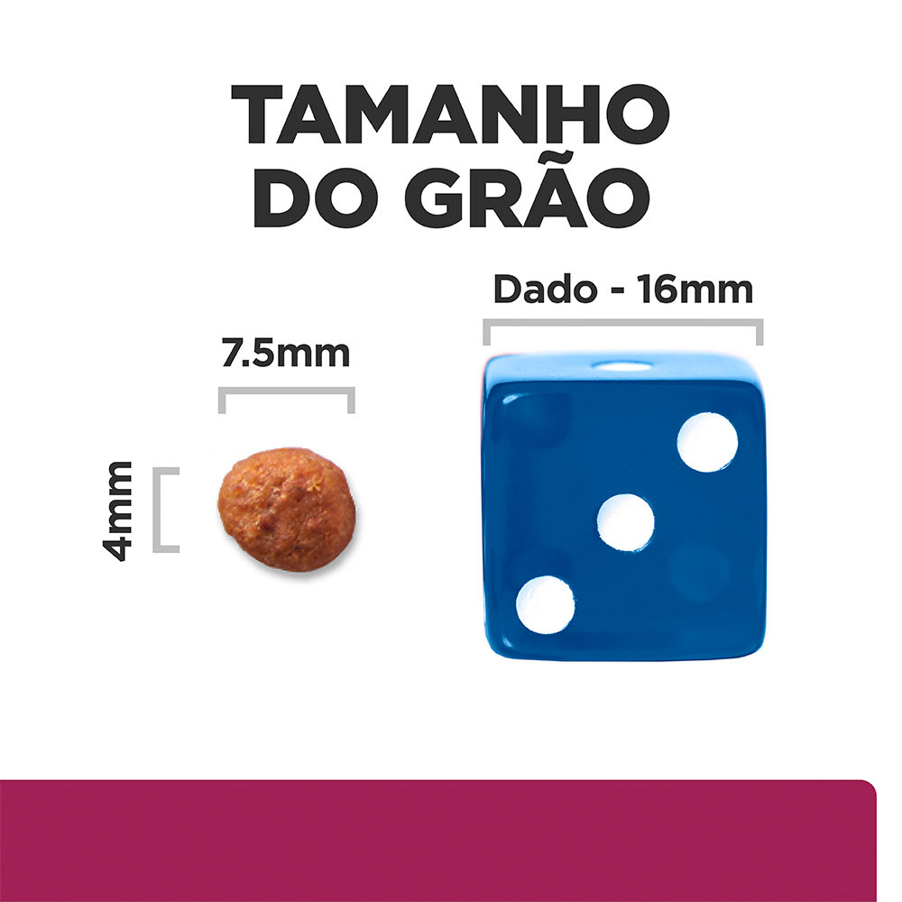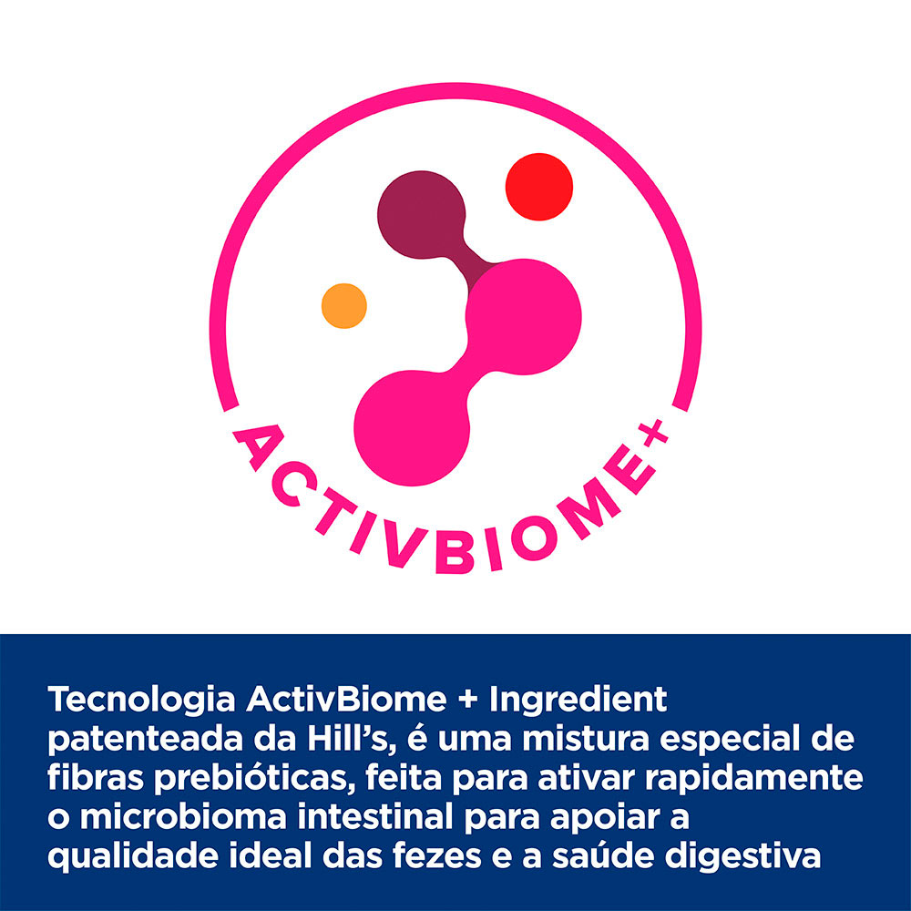 Os grãos têm tamanho reduzido (small bites / pedaços pequenos), facilitando mastigação e ingestão, ideal para cães de porte pequeno, ou para cães adultos com sensibilidade oral. Com tecnologia exclusiva ActivBiome+, uma mistura de fibras prebióticas que estimula o crescimento de bactérias intestinais benéficas, ajudando a restabelecer o equilíbrio digestivo.