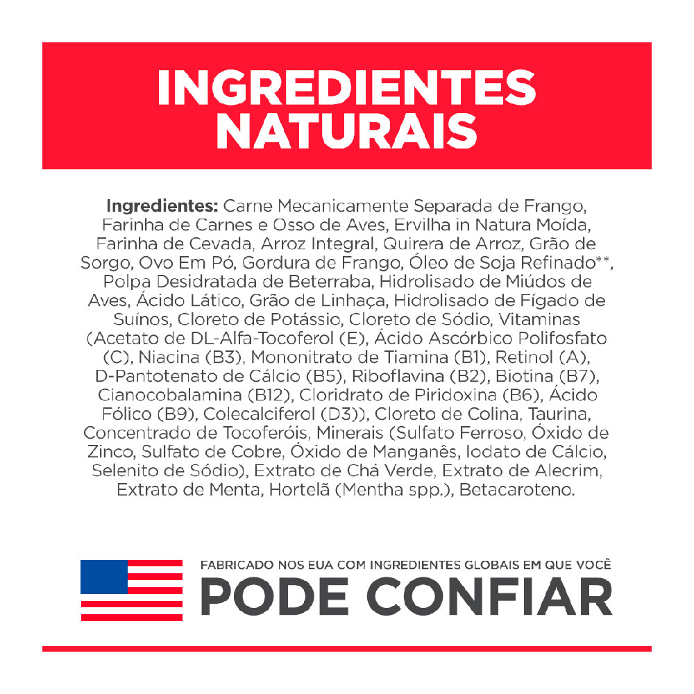 Carne Mecanicamente Separada de Frango, Farinha de Carnes e Osso de Aves, Ervilha in Natura Moída, Farinha de Cevada, Arroz Integral, Quirera de Arroz, Grão de Sorgo, Ovo Em Pó, Gordura de Frango, Óleo de Soja Refinado**, Polpa Desidratada de Beterraba, Hidrolisado de Miúdos de Aves, Ácido Lático, Grão de Linhaça, Hidrolisado de Fígado de Suínos, Cloreto de Potássio, Cloreto de Sódio, Vitaminas (Acetato de DL-Alfa-Tocoferol (E), Ácido Ascórbico Polifosfato (C), Niacina (B3), Mononitrato de Tiamina (B1), Retinol (A), D-Pantotenato de Cálcio (B5), Riboflavina (B2), Biotina (B7), Cianocobalamina (B12), Cloridrato de Piridoxina (B6), Ácido Fólico (B9), Colecalciferol (D3)), Cloreto de Colina, Taurina, Concentrado de Tocoferóis, Minerais (Sulfato Ferroso, Óxido de Zinco, Sulfato de Cobre, Óxido de Manganês, Iodato de Cálcio, Selenito de Sódio), Extrato de Chá Verde, Extrato de Alecrim, Extrato de Menta, Hortelã (Mentha spp.), Betacaroteno.
