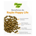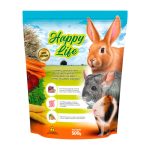 A Ração Happy Life Coelho é formulada para coelhos e outros roedores, com ingredientes como feno de alfafa, vegetais desidratados e cereais integrados.