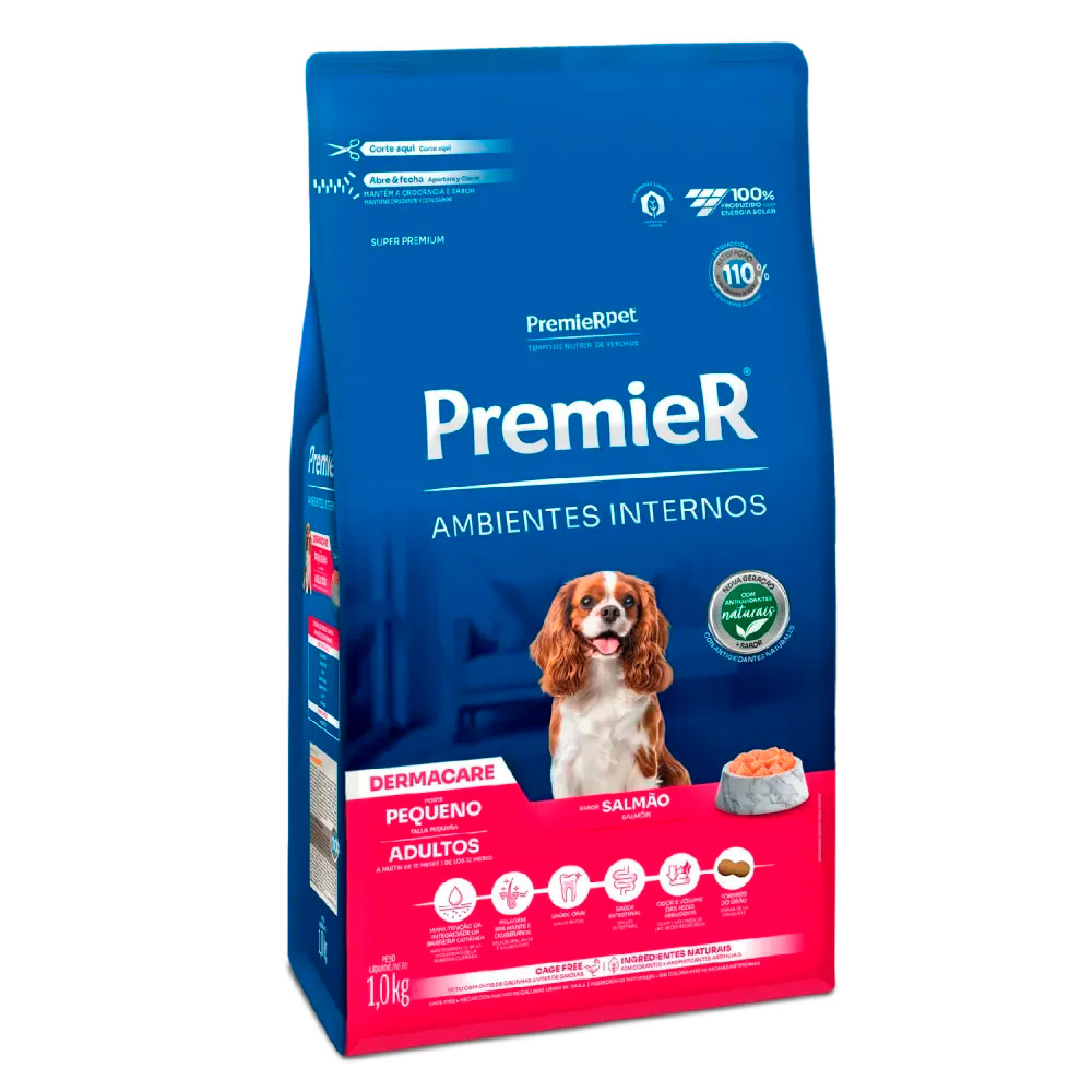 A Ração Premier Ambientes Internos Dermacare Raças Pequenas Adultos Salmão é um alimento Super Premium específico para cães com este estilo de vida.