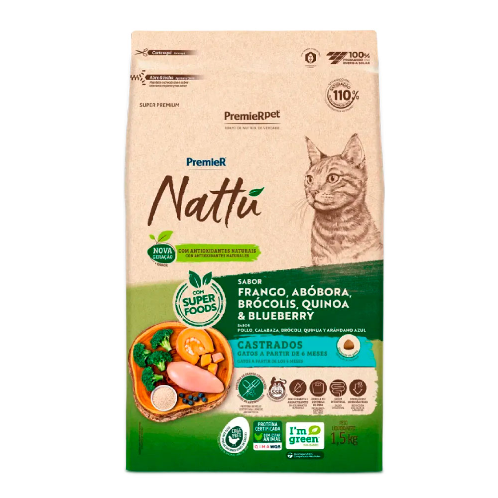 A Ração Premier Nattu Gatos Adultos Castrados Abóbora é ideal a partir dos 6 meses de idade para os felinos que passaram por este procedimento cirúrgico e que necessitam de uma dieta equilibrada. Formulada com ingredientes nobres, sem corantes e aromatizantes artificiais e também sem ingredientes transgênicos.