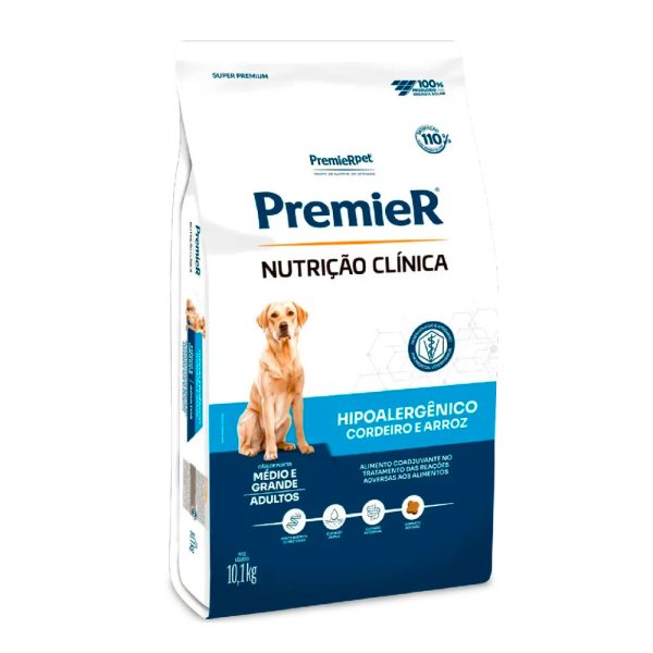 A Premier Nutrição Clínica Hipoalergênico Cães Médio e Grande Porte Cordeiro e Arroz um alimento auxiliar no tratamento de reações adversas ao alimento, indicada para cães que apresentem sintomatologia dermatológica e/ou intestinal. Podendo ser oferecida também a cães com intolerância ao glúten, por não conter grãos em sua composição.