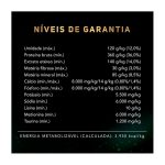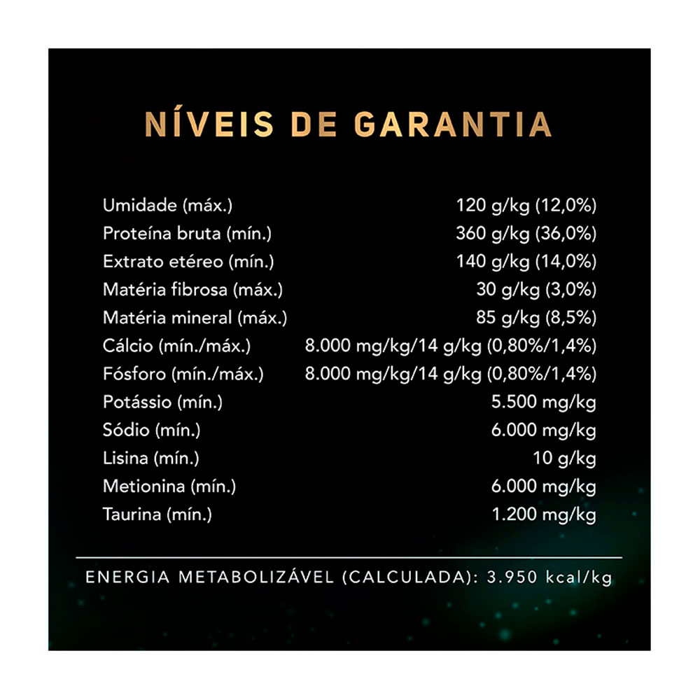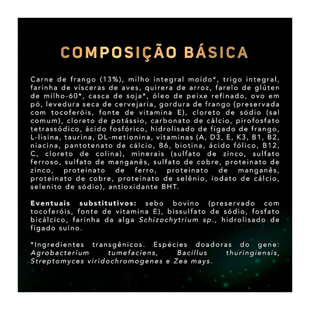 Carne de frango (13%), milho integral moído*, trigo integral, farinha de vísceras de aves, quirera de arroz, farelo de glúten de milho-60*, casca de soja*, óleo de peixe refinado, ovo em pó, levedura seca de cervejaria, gordura de frango (preservada com tocoferóis, fonte de vitamina E), cloreto de sódio (sal comum), cloreto de potássio, carbonato de cálcio, pirofosfato tetrassódico, ácido fosfórico, hidrolisado de fígado de frango, L-lisina, taurina, DL metionina, vitaminas (A, D3, E, K3, B1, B2, niacina, pantotenato de cálcio, B6, biotina, ácido fólico, B12, C, cloreto de colina), minerais (sulfato de zinco, sulfato ferroso, sulfato de manganês, sulfato de cobre, proteinato de zinco, proteinato de ferro, proteinato de manganês, proteinato de cobre, proteinato de selênio, iodato de cálcio, selenito de sódio), antioxidante BHT.