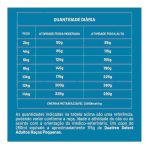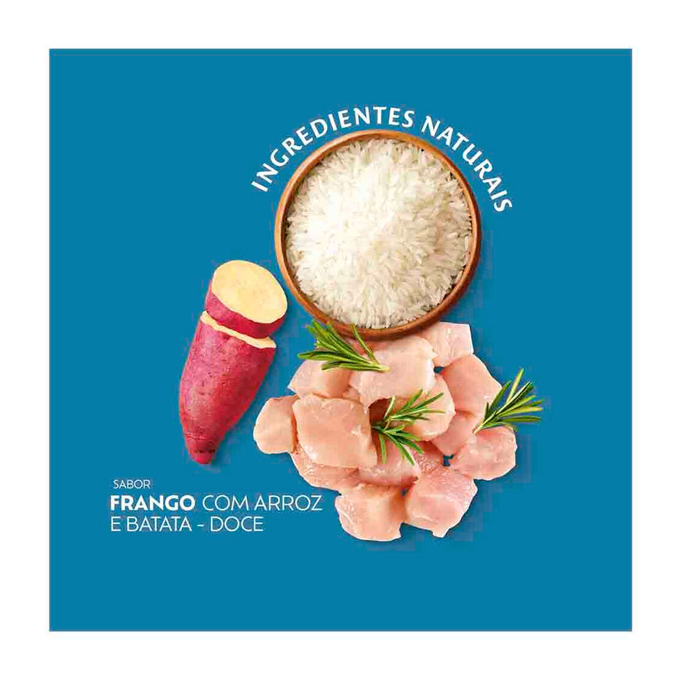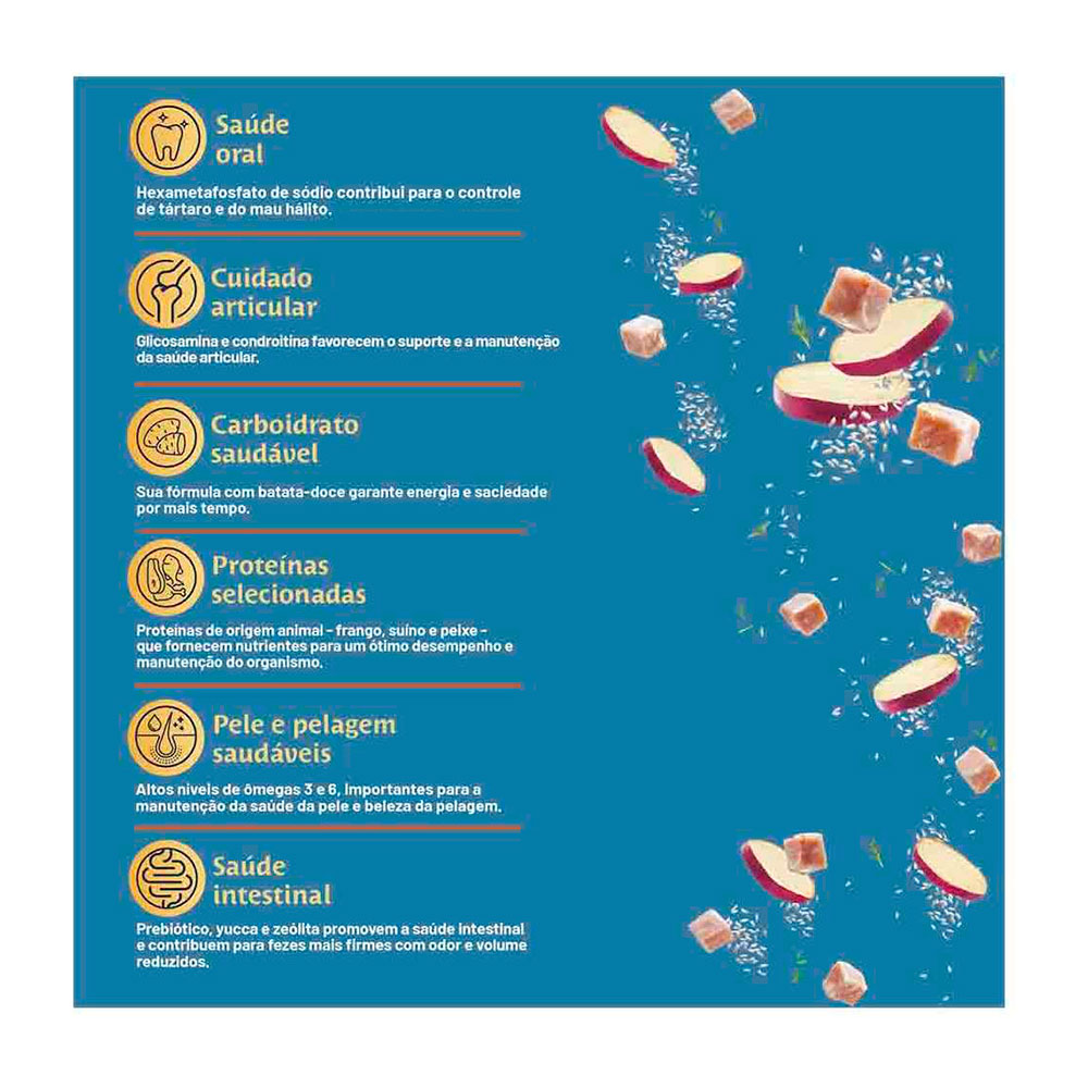 Farinha de vísceras de frango (mín. 10%), farinha de torresmo (mín. 1%), farinha de peixes (mín. 0,5%), milho moído¹, sorgo integral moído, farinha de batata doce (mín. 0,5%), óleo de aves, gordura suína, quirera de arroz (mín. 3%), grão de linhaça, farelo de trigo, farelo de glúten de milho-601, levedura de cervejaria inativada desidratada, levedura de cana-de-açúcar autolisada e desidratada, polpa desidratada de beterraba, lignocelulose, cloreto de sódio, cloreto de potássio, zeólita (mín. 0,4%), extrato de yucca (mín. 0,025%), hexametafosfato de sódio (mín. 0,1%), sulfato de glicosamina, sulfato de condroitina, mananoligossacarídeos (MOS) (mín. 0,1%), hidrolisado de fígado de aves e suíno, BHT/BHA, ácido propiônico, parede celular de levedura, acetato de retinol (vit. A), colecalciferol (vit. D3), ácido ascórbico (vit. C), acetato de DL-alfa-tocoferol (vit. E), mononitrato de tiamina (vit. B1), riboflavina (vit. B2), cloridrato de piridoxina (vit. B6), cianocobalamina (vit. B12), bissulfito de menadiona nicotinamida (vit. K3), biotina, cloreto de colina, niacina (ácido nicotínico), ácido fólico, D-pantotenato de cálcio (ácido pantotênico), sulfato de cobre monohidratado, sulfato de ferro, sulfato de zinco, sulfato de manganês, selenito de sódio, iodato de cálcio, proteinato de manganês, proteinato de selênio, proteinato de zinco
