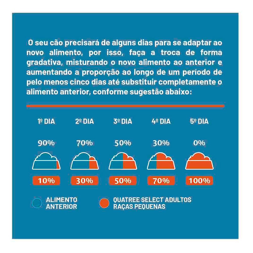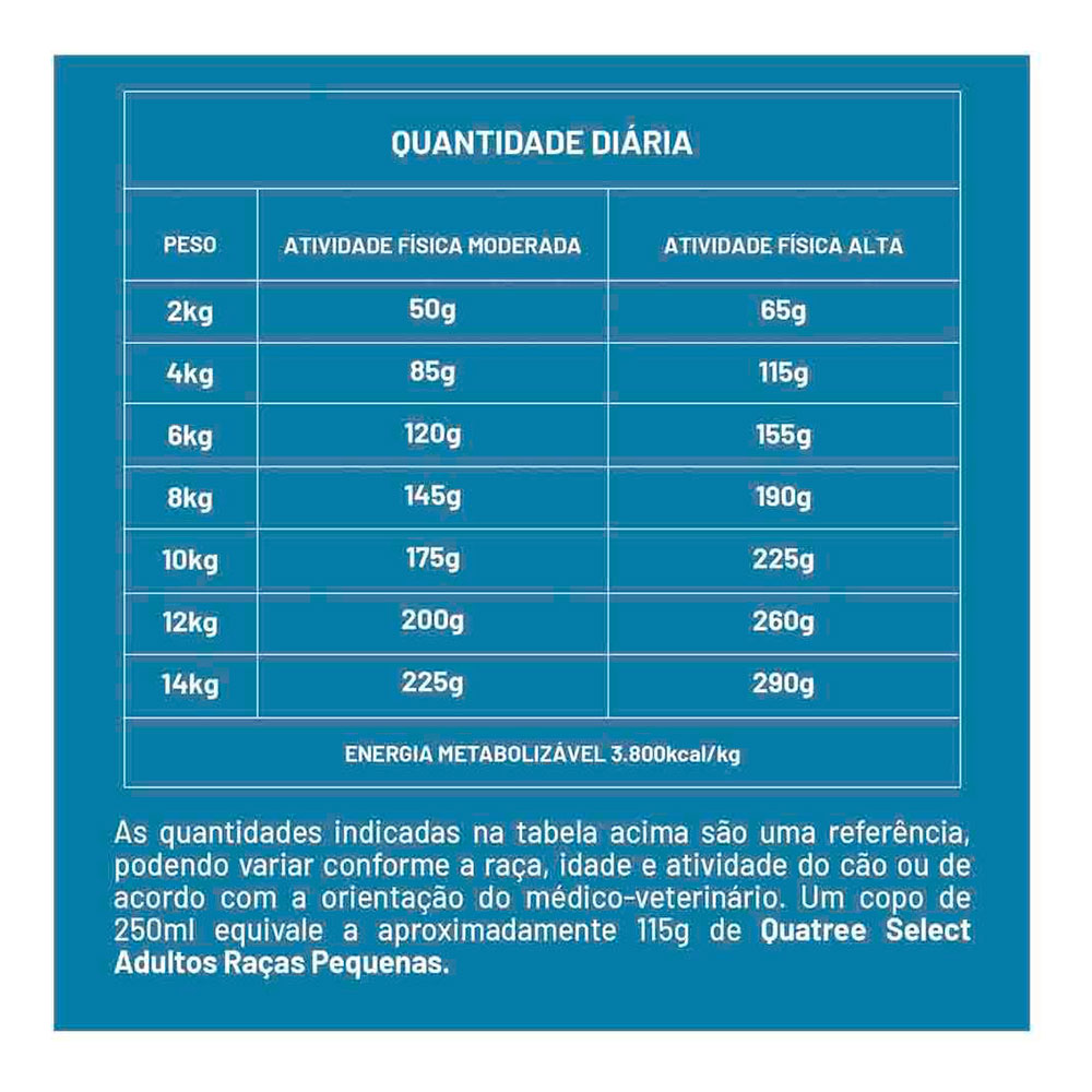 Fornecer diariamente o alimento Quatree Select Raças Pequenas dividido em duas a quatro porções, de acordo com o peso do animal.