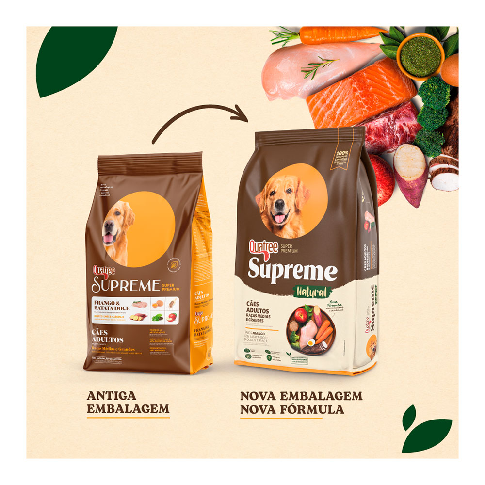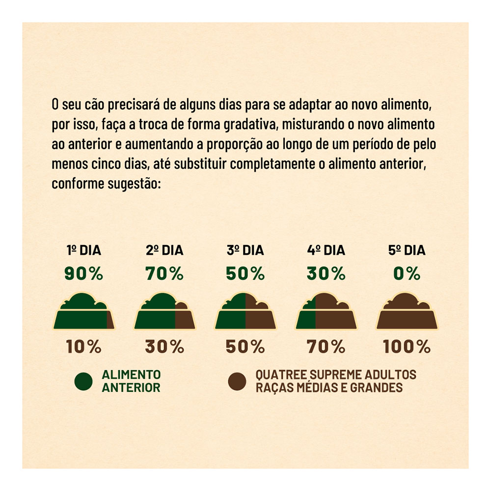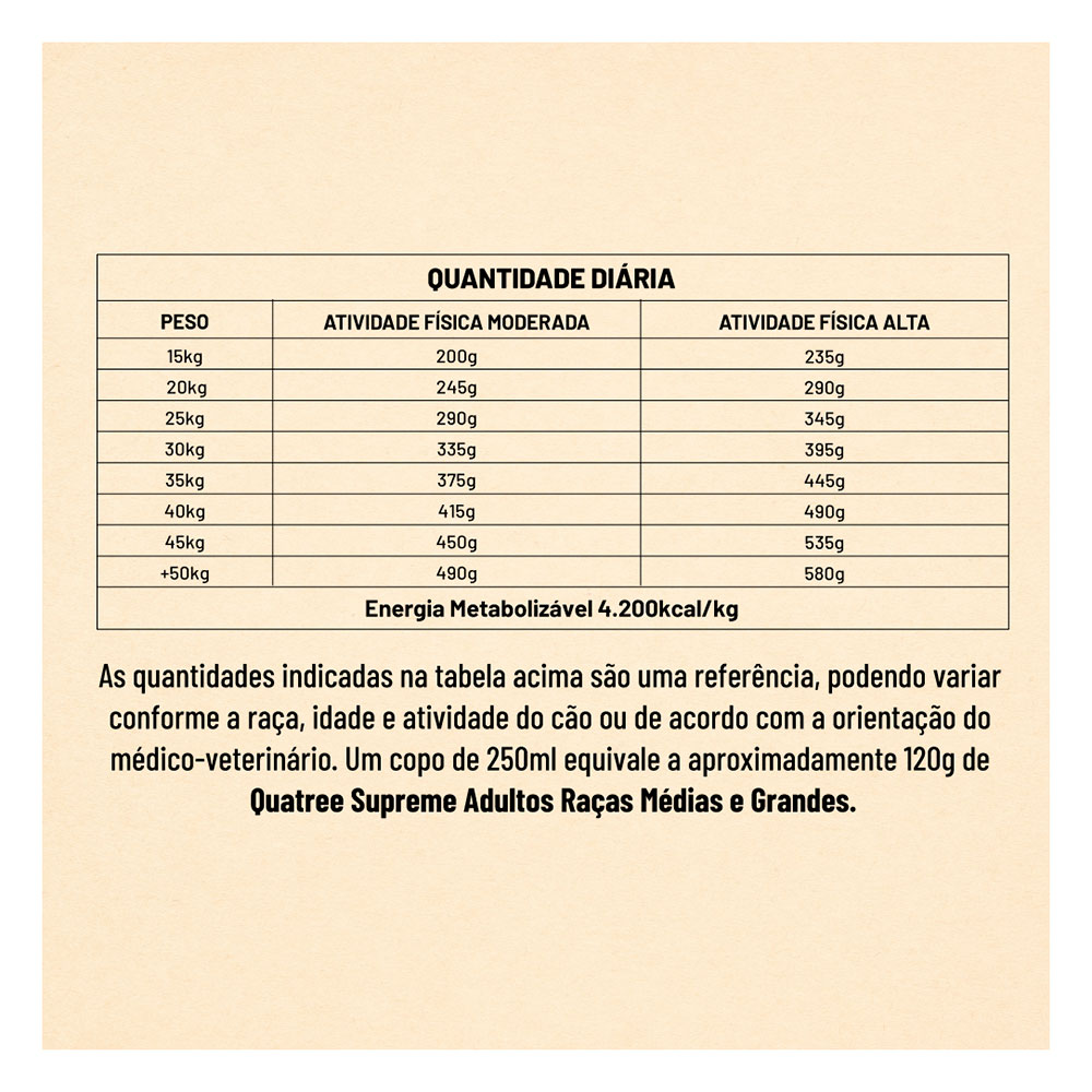 Fornecer diariamente o alimento Quatree Supreme Natural Cães Adultos Raças Médias e Grandes dividido em duas porções, de acordo com o peso do animal.