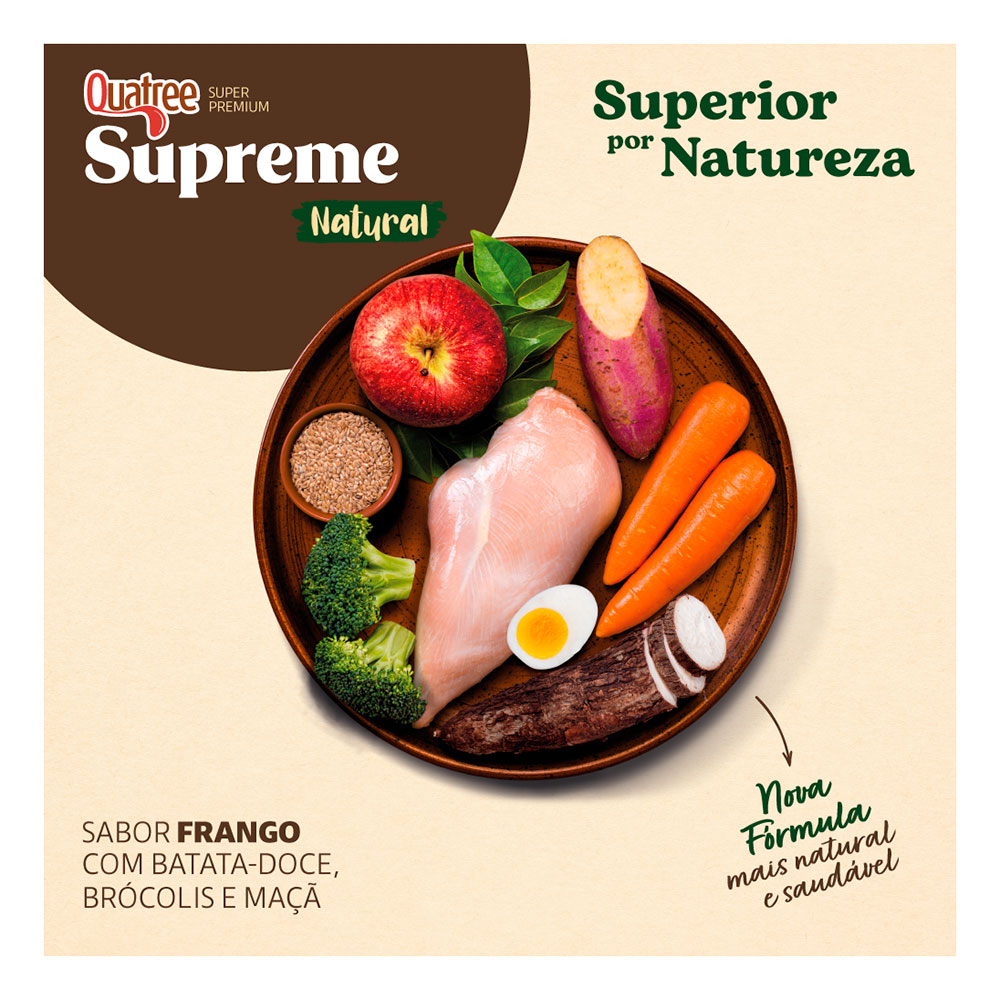 Quatree Supreme Cães Adultos contém hexametafosfato de sódio que reduz o acúmulo de tártaro e melhora a saúde bucal. Além disso, auxilia no equilíbrio da flora intestinal com as fibras naturais prebióticas (MOS e FOS), polpa de beterraba e extrato de yucca que asseguram ótima digestibilidade. Contém Ômega 3 e 6, além da maçã e chá verde com potente ação antioxidante que reforça as defesas naturais do organismo. Protege as articulações, pois contém condroprotetores, glucosamina e condroitina que auxiliam na proteção e no fortalecimento dos sistemas ósseo e articular.