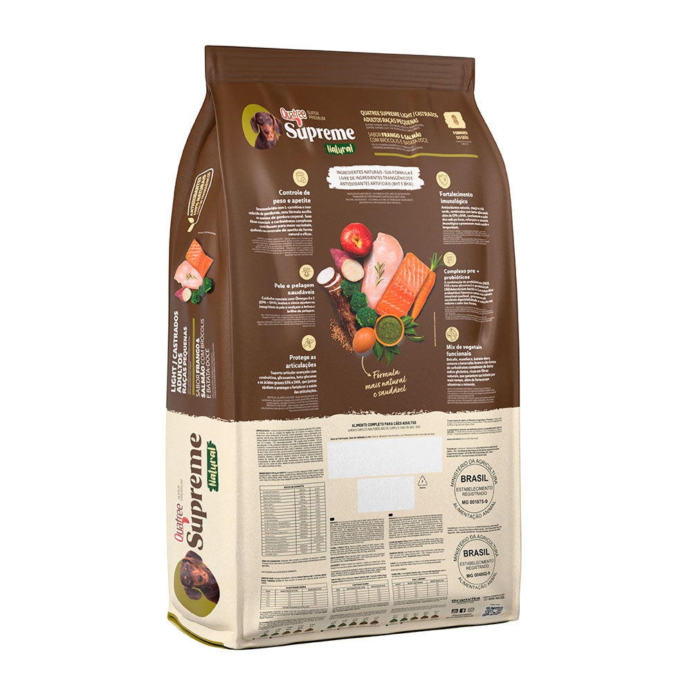 Quatree Supreme Cães Light possui níveis de gorduras reduzidos e com isso faz o controle de peso ideal. Contém ingredientes com ação potente antioxidante que atua na neutralização da formação de radicais livres, além de reforçar as defesas naturais do organismo. Ajuda na saúde intestinal e conta com alta digestibilidade, pois possui fibras funcionais: prebióticos (MOS e FOS), polpa de beterraba e extrato de yucca que também colaboram para a redução de volume e odor das fezes.