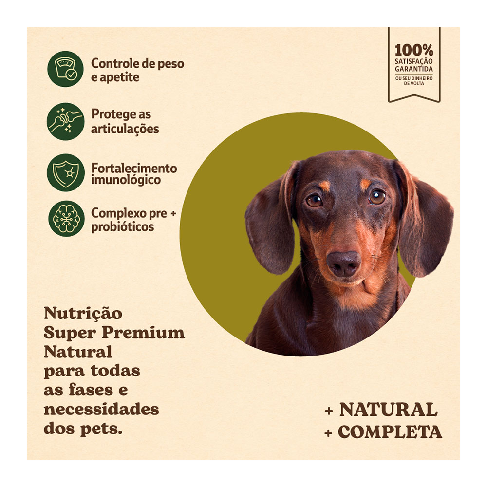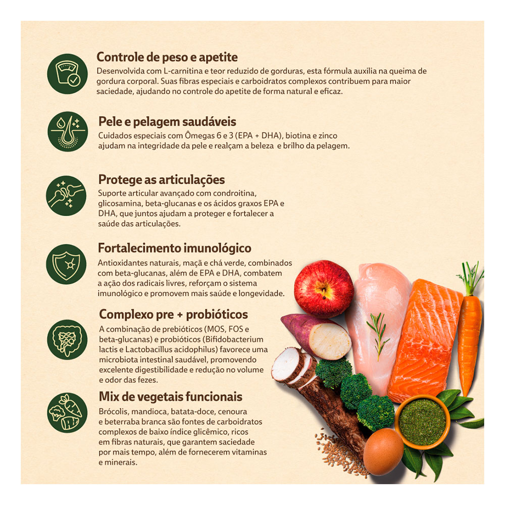Farinha de vísceras de frango (mín. 20%), farinha de salmão (mín. 0,5%), farinha de torresmo, ovo em pó, complexo de vegetais (mín. 4,5%) (farinha de mandioca, farinha de batata-doce, polpa desidratada de beterraba, brócolis desidratado e cenoura desidratada), arroz quebrado, grão de sorgo, óleo de aves, gordura suína, óleo de peixes – fonte de EPA e DHA, grão de linhaça, levedura de cervejaria inativada desidratada, extrato de leveduras, lignocelulose, prebióticos (mín. 0,3%) (inulina – FOS, mananoligossacarídeos – MOS e parede celular de levedura – fonte de beta-glucanas 1,3-1,6), probióticos (biomassa microbiana de Bifidobacterium lactis e Lactobacillus acidophilus), hexametafosfato de sódio (mín. 0,2%), sulfato de glicosamina, sulfato de condroitina, extrato de yucca, aluminossilicato de cálcio e sódio, DL-metionina, L-carnitina, hidrolisado de fígado de aves e suíno, cloreto de sódio, cloreto de potássio, antioxidantes naturais (mín. 0,15%) (extrato de alecrim, tocoferol (concentrado), extrato de chá verde (Camellia sinensis) e maçã desidratada), ácido propiônico, vitamina A, vitamina D3, vitamina E, vitamina K3, vitamina C, vitamina B1, vitamina B2, vitamina B6, vitamina B12, niacina (ácido nicotínico), cloreto de colina, ácido fólico, biotina, D-pantotenato de cálcio, sulfato de cobre monohidratado, sulfato de ferro, sulfato de manganês, sulfato de zinco, iodato de cálcio, selenito de sódio, proteinato de manganês, levedura enriquecida com selênio, proteinato de zinco.