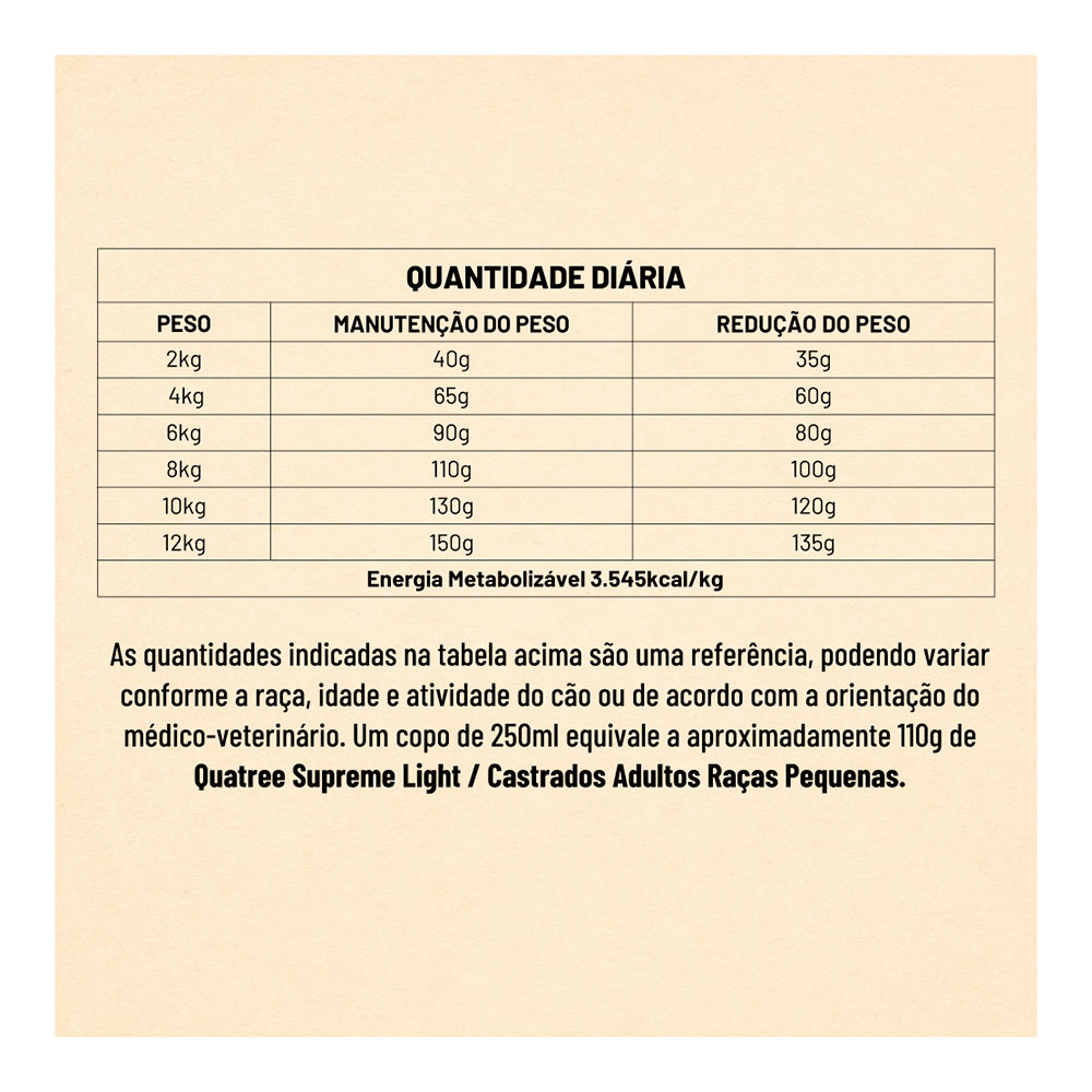 Fornecer diariamente o alimento Quatree Supreme Cães Light de acordo com o peso do animal.