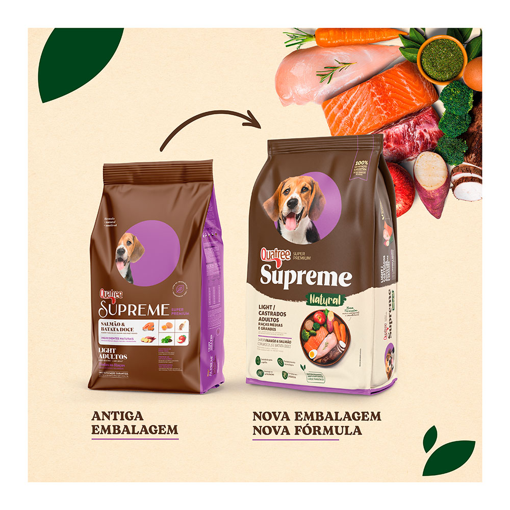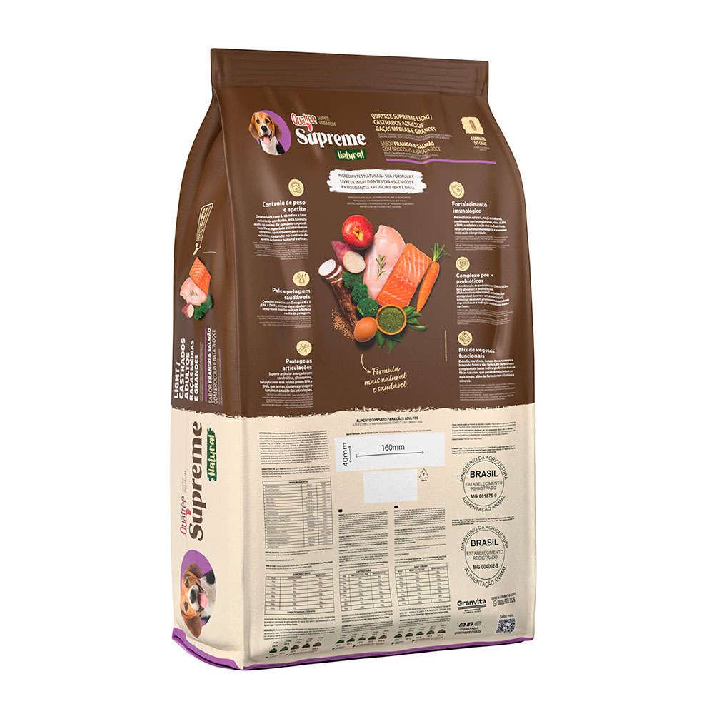 Quatree Supreme Cães Light possui níveis de gorduras reduzidos e com isso faz o controle de peso ideal. Contém ingredientes com ação potente antioxidante que atua na neutralização da formação de radicais livres, além de reforçar as defesas naturais do organismo. Ajuda na saúde intestinal e conta com alta digestibilidade, pois possui fibras funcionais: prebióticos (MOS e FOS), polpa de beterraba e extrato de yucca que também colaboram para a redução de volume e odor das fezes.