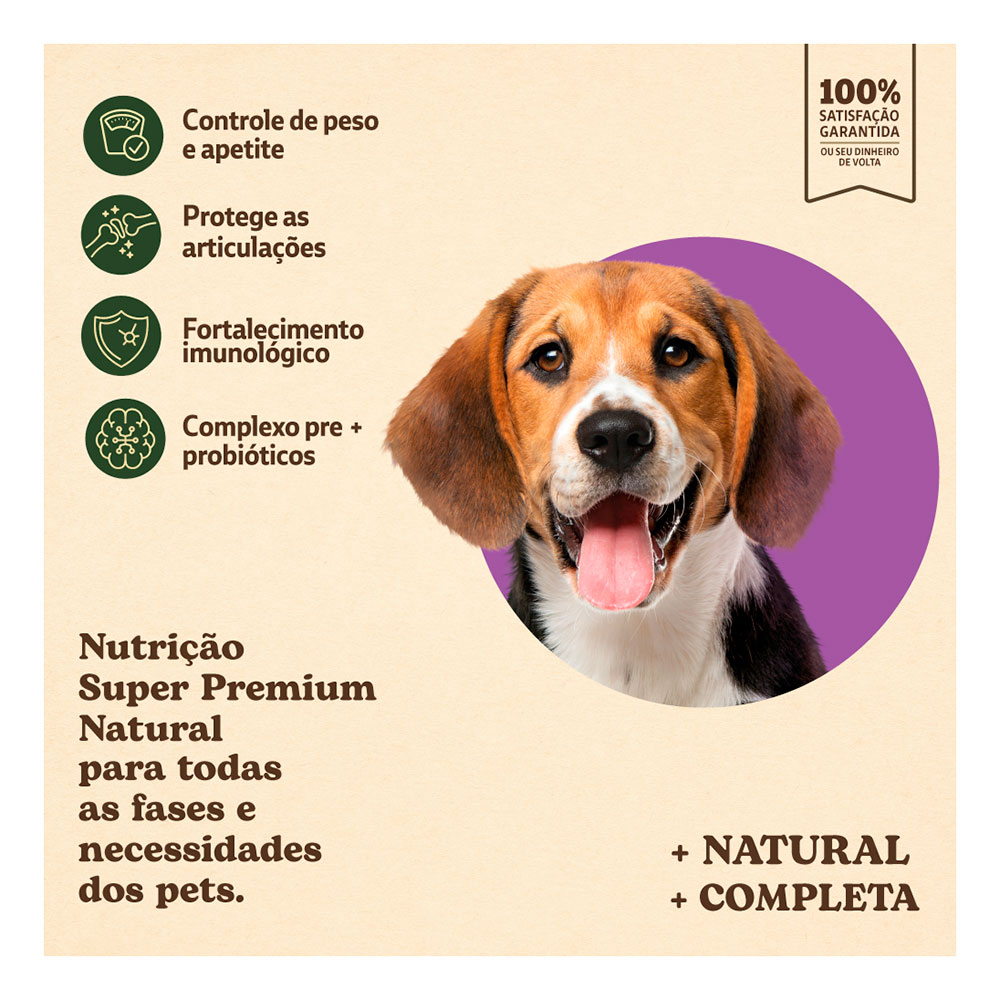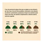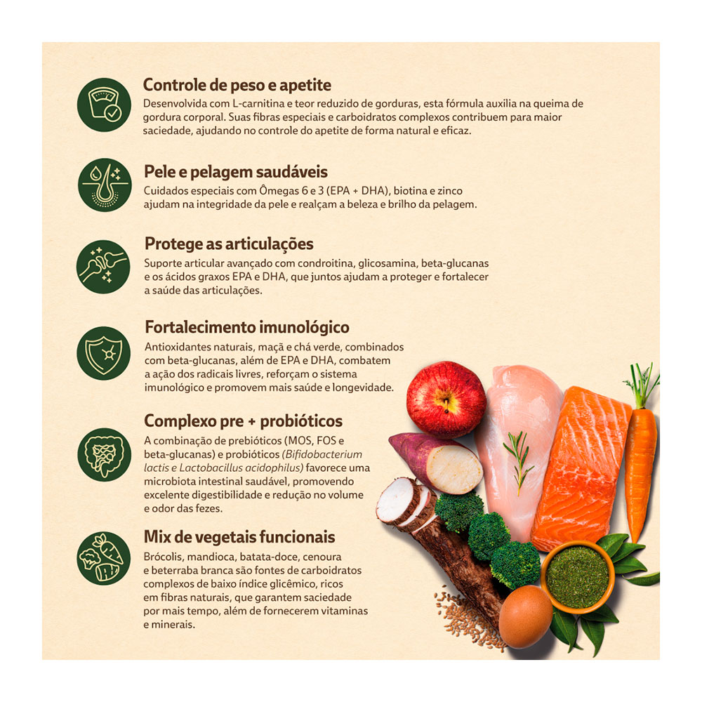 Farinha de vísceras de frango (mín. 20%), farinha de salmão (mín. 0,5%), farinha de torresmo, ovo em pó, complexo de vegetais (mín. 4,5%) (farinha de mandioca, farinha de batata-doce, polpa desidratada de beterraba, brócolis desidratado e cenoura desidratada), arroz quebrado, grão de sorgo, óleo de aves, gordura suína, óleo de peixes – fonte de EPA e DHA, grão de linhaça, levedura de cervejaria inativada desidratada, extrato de leveduras, lignocelulose, prebióticos (mín. 0,3%) (inulina – FOS, mananoligossacarídeos – MOS e parede celular de levedura – fonte de beta-glucanas 1,3-1,6), probióticos (biomassa microbiana de Bifidobacterium lactis e Lactobacillus acidophilus), hexametafosfato de sódio (mín. 0,2%), sulfato de glicosamina, sulfato de condroitina, extrato de yucca, aluminossilicato de cálcio e sódio, DL-metionina, L-carnitina, hidrolisado de fígado de aves e suíno, cloreto de sódio, cloreto de potássio, antioxidantes naturais (mín. 0,15%) (extrato de alecrim, tocoferol (concentrado), extrato de chá verde (Camellia sinensis) e maçã desidratada), ácido propiônico, vitamina A, vitamina D3, vitamina E, vitamina K3, vitamina C, vitamina B1, vitamina B2, vitamina B6, vitamina B12, niacina (ácido nicotínico), cloreto de colina, ácido fólico, biotina, D-pantotenato de cálcio, sulfato de cobre monohidratado, sulfato de ferro, sulfato de manganês, sulfato de zinco, iodato de cálcio, selenito de sódio, proteinato de manganês, levedura enriquecida com selênio, proteinato de zinco.